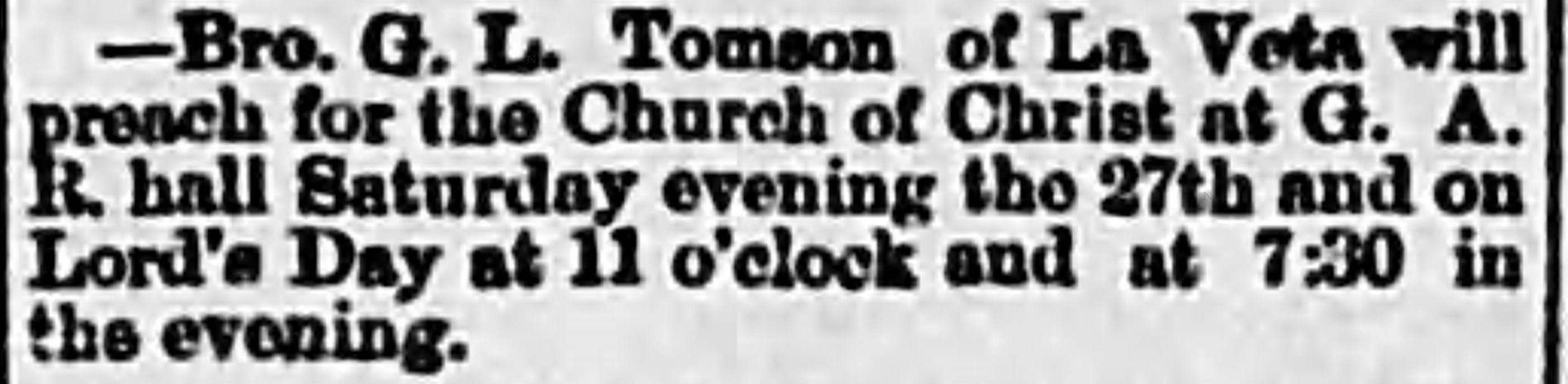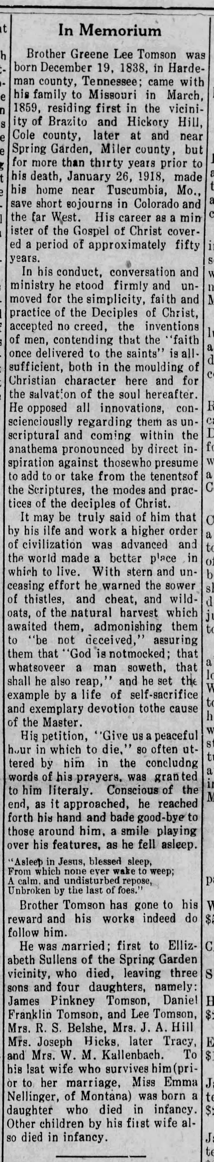 Brother Greene Lee Tomson was born December 19, 1838, in Hardeman county, Tennessee; came with his family to Missouri in March, 1859, residing first in the vicinity of Brazito and Hickory Hill, Cole county, later at and near Spring Garden, Miler county, but for more than thirty years prior to his death, January 26, 1918, made his home near Tuscumbia, Mo., save short sojourns in Colorado and the far West. His career as a minister of the Gospel of Christ covered a period of approximately fifty years.