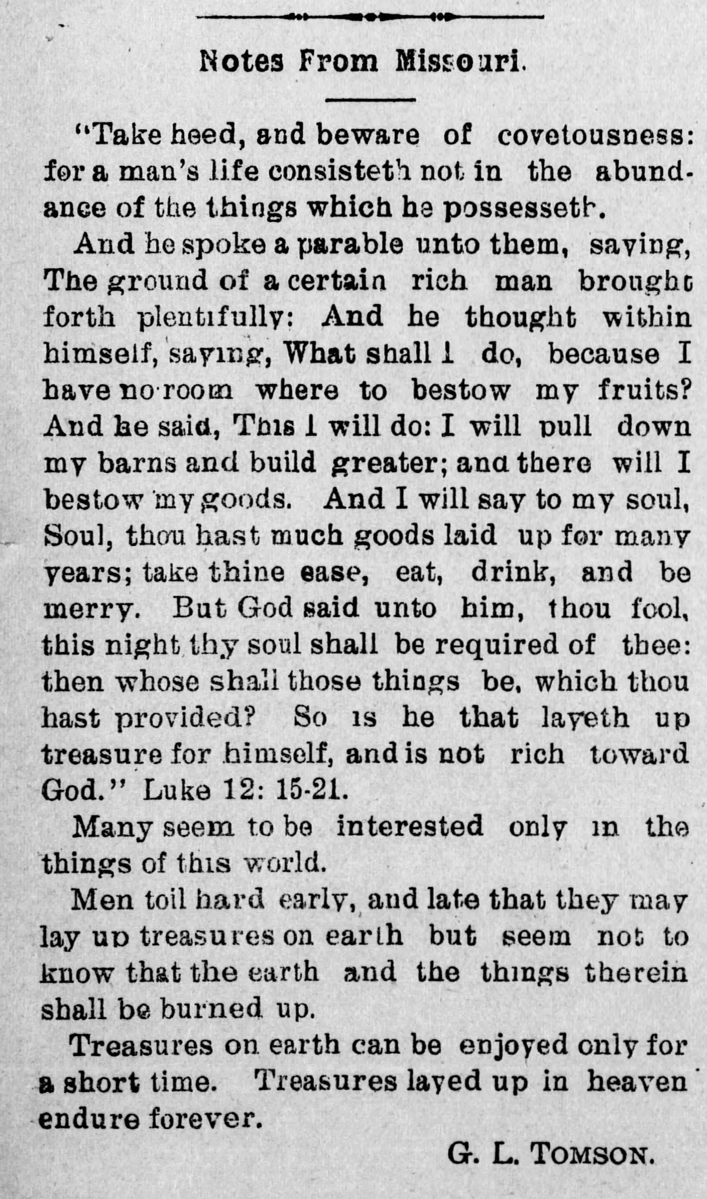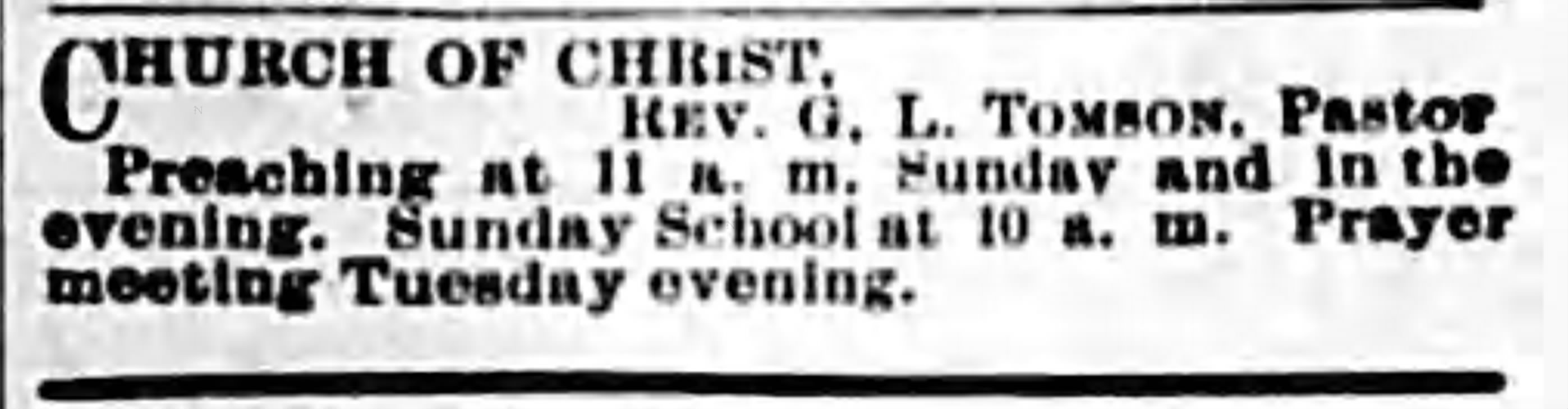 Greene Lee Tomson’s family were dedicated Christians, and had been so for three generations. His grandfather, Henry Tomson, was a gospel preacher. Though his father, Thomas, was not so recognized, he served faithfully in the church where he was. Two of his sons preached. J. H. D. Tomson, preached in many different regions of the country. Greene Lee's career as a minister of the gospel was mostly in the region of his Missouri home, and extended over approximately fifty years. He began preaching at Ginger Ridge Church, north of Tuscumbia, Missouri, in the days when the countryside was still young and communities were scattered.