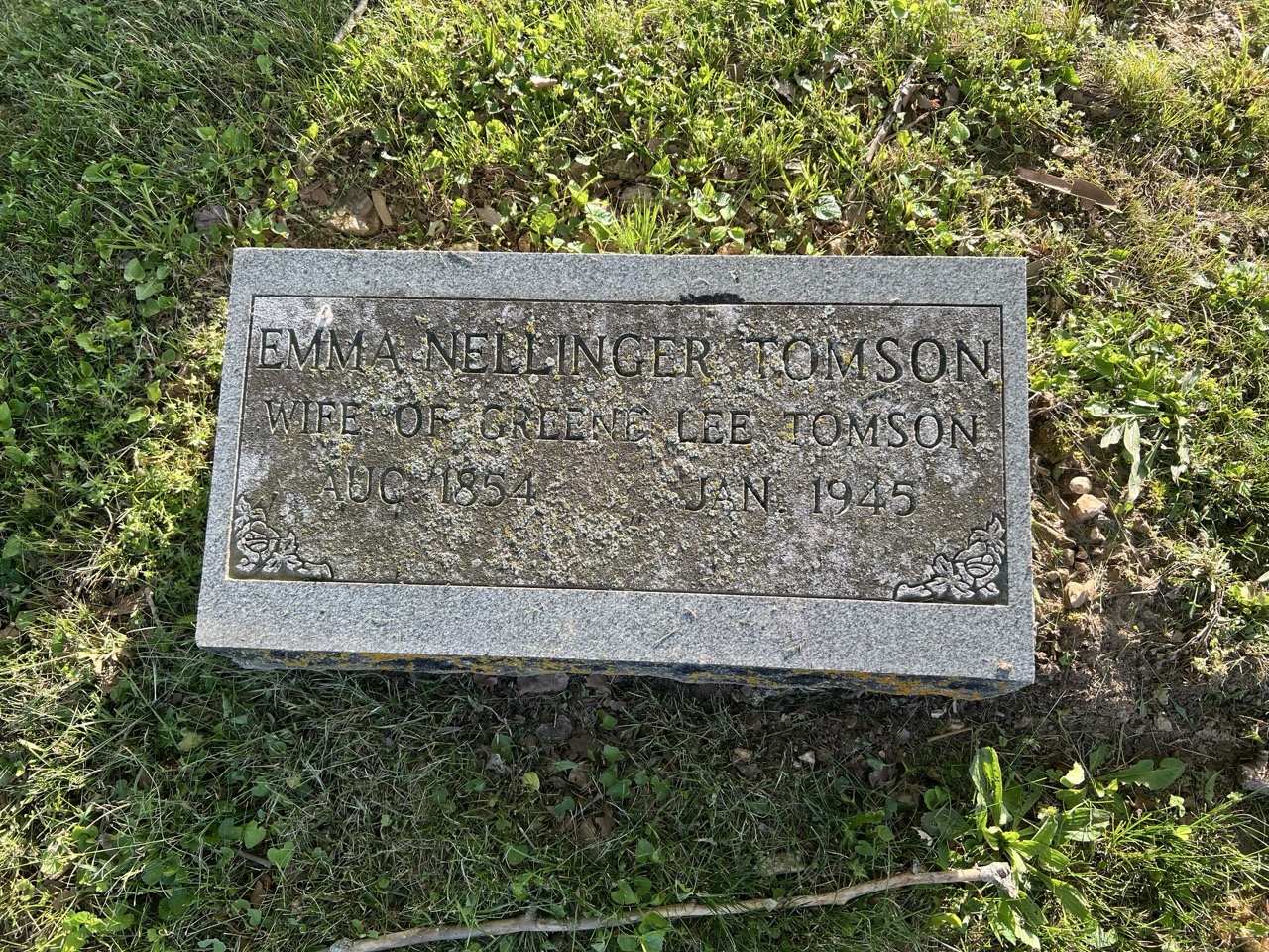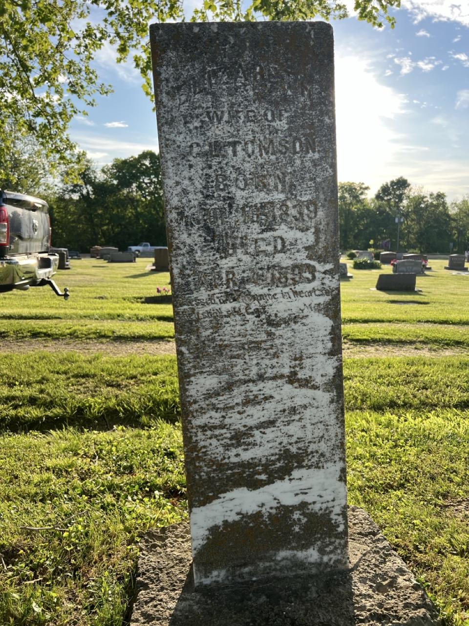 Elder Greene Lee Tomson was buried beside his first wife, Elizabeth (Sullens) Tomson, in Tuscumbia Cemetery, Miller County, Missouri. His second wife, Emma (Nellinger) Tomson, survived him, as did many descendants through the children of his first marriage, and at her death was buried on his other side.
