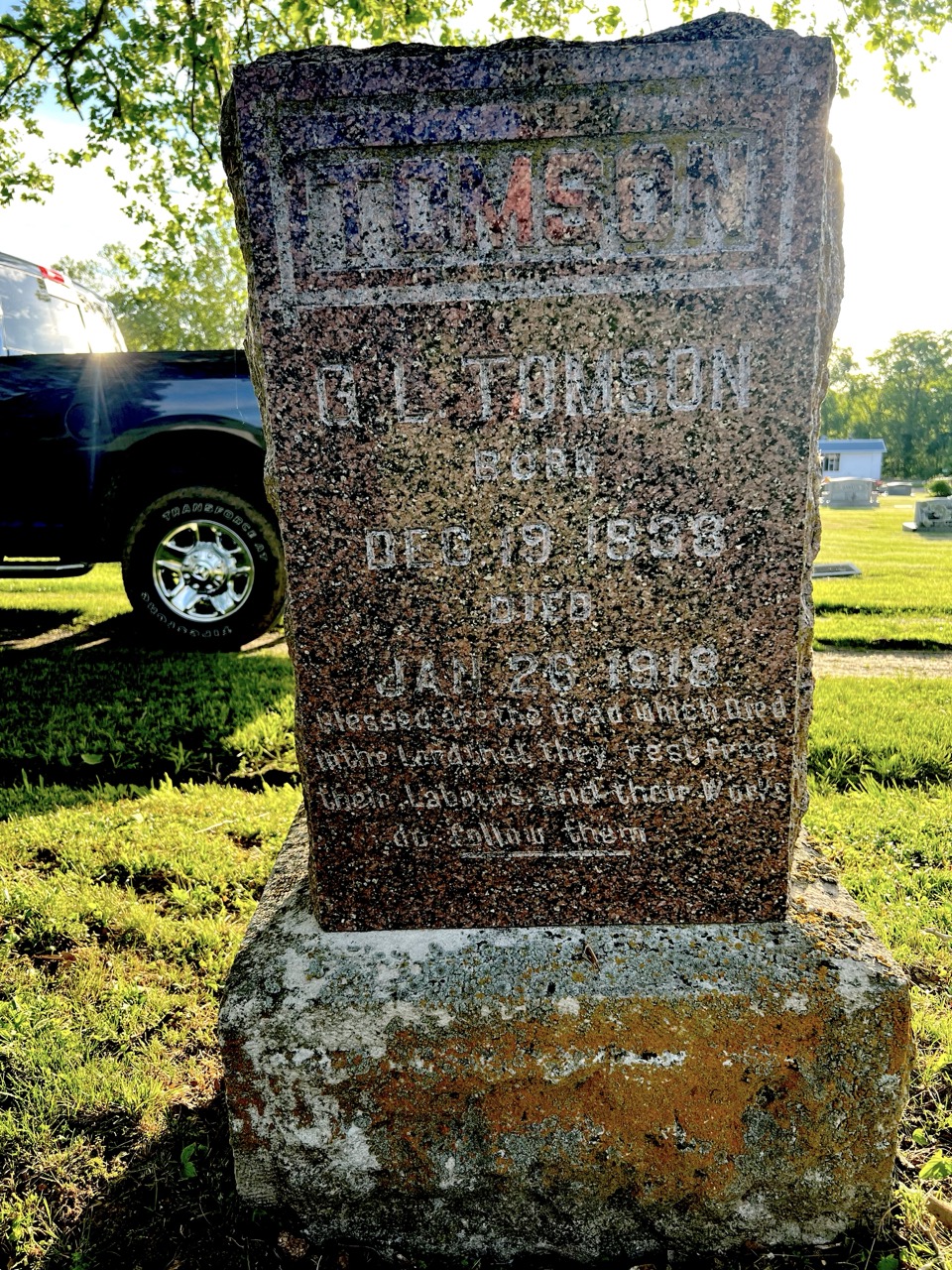Special Recognition: Special thanks to Scott and Lisa Carr, descendants of the Henry Tomson family for taking me to Tuscumbia, Missouri to visit the graves of G. L. Tomson and his extended family, May 4, 2025. Lisa's father Warren Pemberton, who passed away in 2023, was my first contact with Tomson family back in 2019. Many thanks to this wonderful family for their assistance in locating information on this faithful family to New Testament Christianity through the American Restoration Movement.