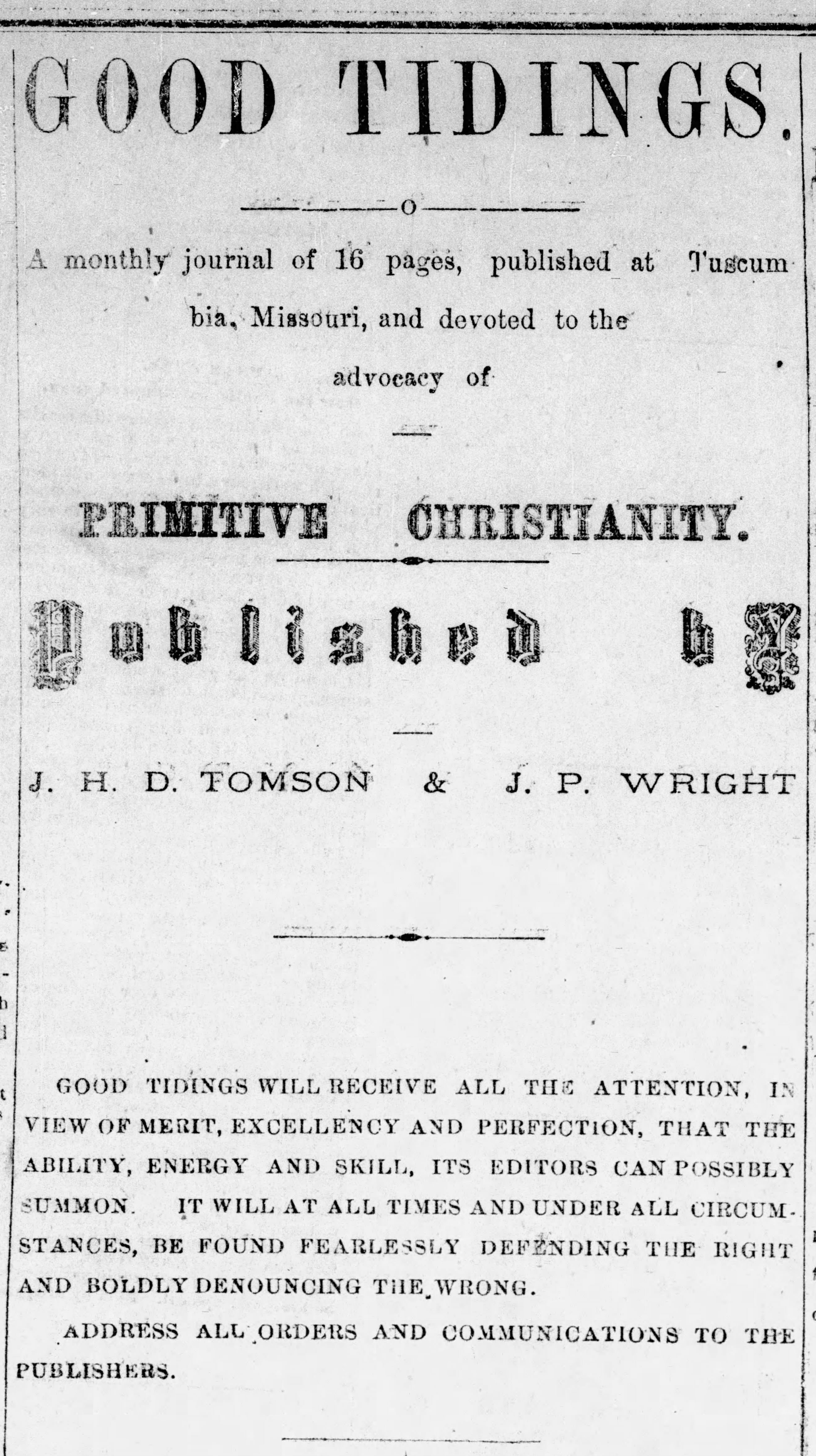 J. H. D. Tomson was married twice, to Miss Ann Eliza Rainey, October 15, 1855; to this union were born five sons and one daughter, the writer of this sketch being the only one living. In A. D. 1858, he removed to Mo., where he spent the greater part of his life. He was married the second time to Miss Salena-Mullin, of Lawson Mo., a most excellent Christian woman. My father obeyed the gospel under the preaching of Bro. O. P. Davis, at Spring Garden, Missouri, and was buried with his Lord in baptism Nov. 30, 1863, after a thickness of ten or twelve inches of ice had been cut. I never heard my father use a by-word, or engage in foolish jesting.