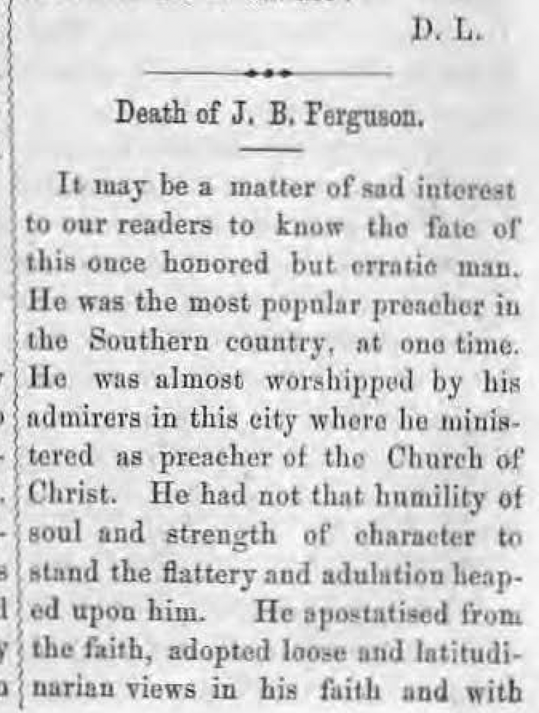We are pained to chronicle this morning the death of our eminent fellow citizen, Rev. J. B. Ferguson, who died at his residence yesterday morning, three miles from the city, after a lingering disease. Some years ago, when Mr. Ferguson was pastor of the Christian Church, he enjoyed a reputation for pulpit oratory second to no man in the South. He commenced life as a printer's boy, and was emphatically a self-made man, having by studious attention, while employed at the printing business, fitted himself for the ministry. He was a man of popular manners, warm and open-hearted in his nature, and generally esteemed by a large circle of friends.
