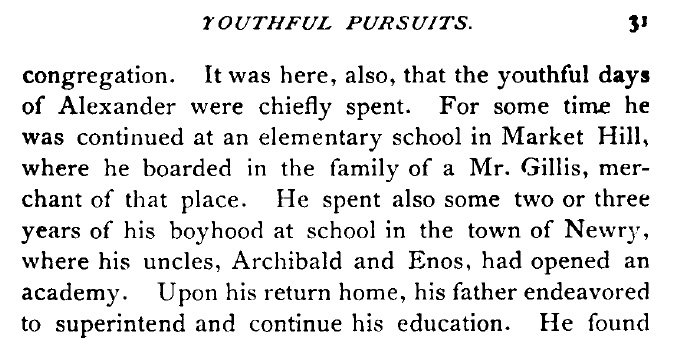 "Of the remaining brothers, James and Archibald engaged in teaching, along with Thomas, when quite young, near Sheepbridge, two miles from Newry, and both of them became members finally of the Secession Church. James seems afterward to have led rather an unsettled life, emigrating finally to Canada. Archibald and Enos, however, devoted themselves to the business of teaching in the town of Newry—a profession in which they were eminently successful.