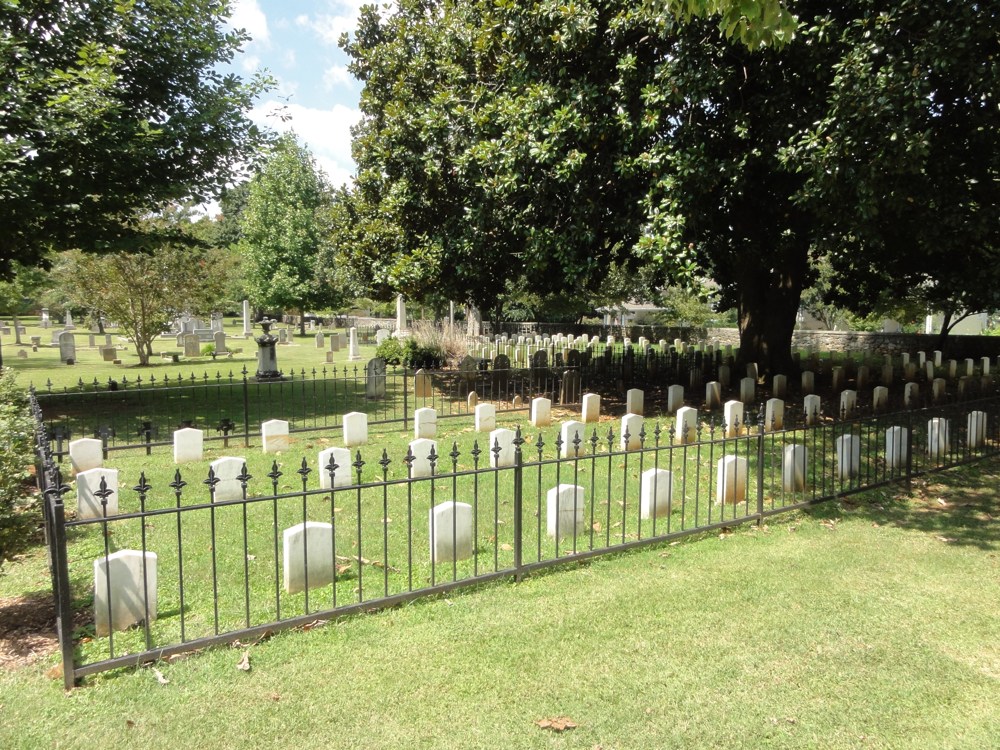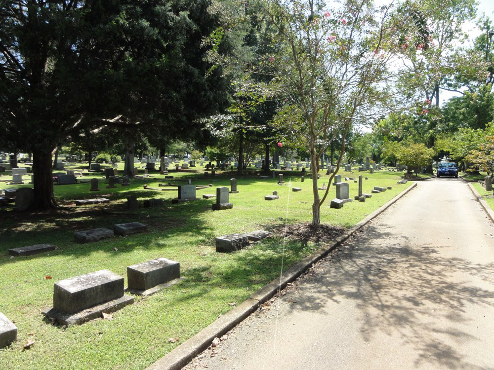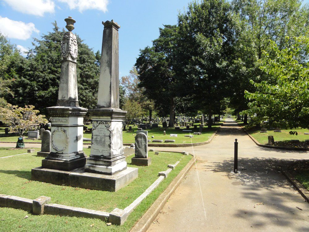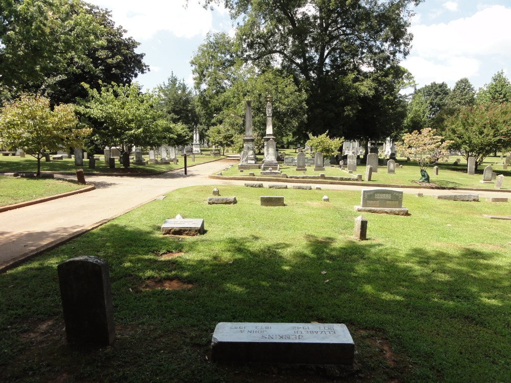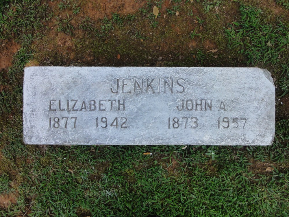 John A. & Elizabeth Jenkins are buried in the old Maple Hill Cemetery. The address is 202 Maple Hill St SE, Huntsville, AL 35801. Enter the main entrance, and head past the office (on right). Go to the second left. (Probably have to park on main road, as it is a very narrow drive.) Go to the second cross street and turn right. The Jenkins plot is on the left just in front of some trees.