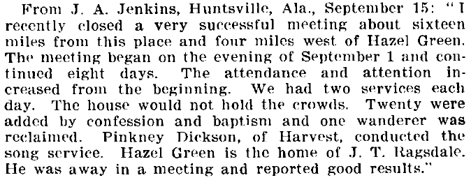 By this time he was hungry for a place to teach the Bible as did his father, Nathaniel Jenkins. In 1908 he had no money, but he persuaded my uncle, J. I. Jones and L. T. Welsh to go with him to ask the downtown Huntsville, the Randolph Street church, to help finance a gospel meeting.