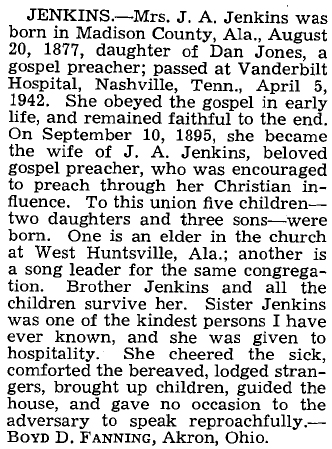 All of his children are Christians and almost all of his grandchildren and great grandchildren, too. Three of his five grandsons are outstanding preachers. They are: Ancil Jenkins, Minister of the University Church in Albuquerque, N.M.; Jerry Jenkins, Minister of the Woodlawn Church in Birmingham; and Dan Jenkins, Minister of the Shades Mountain Church in Birmingham.