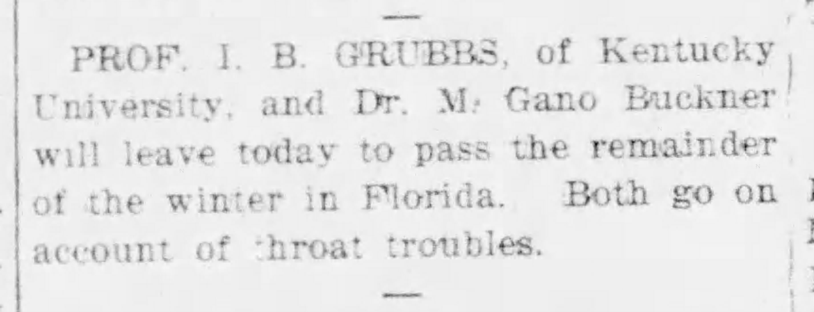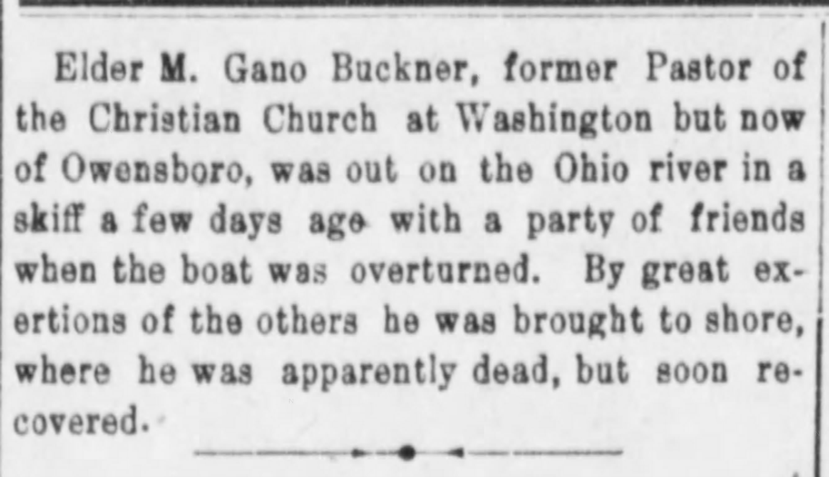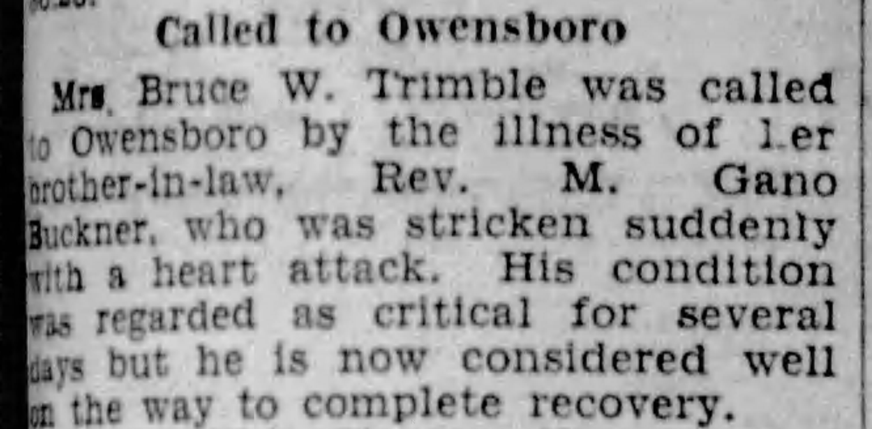 In January 1931, M. Gano Buckner suffered a heart attack, and many were concerned if he would survive. The family went to his Owensboro home to see him. He managed to continue for several months until he succumbed to his illness on July 25, 1931. His body was taken to Mt. Sterling, Kentucky for burial.