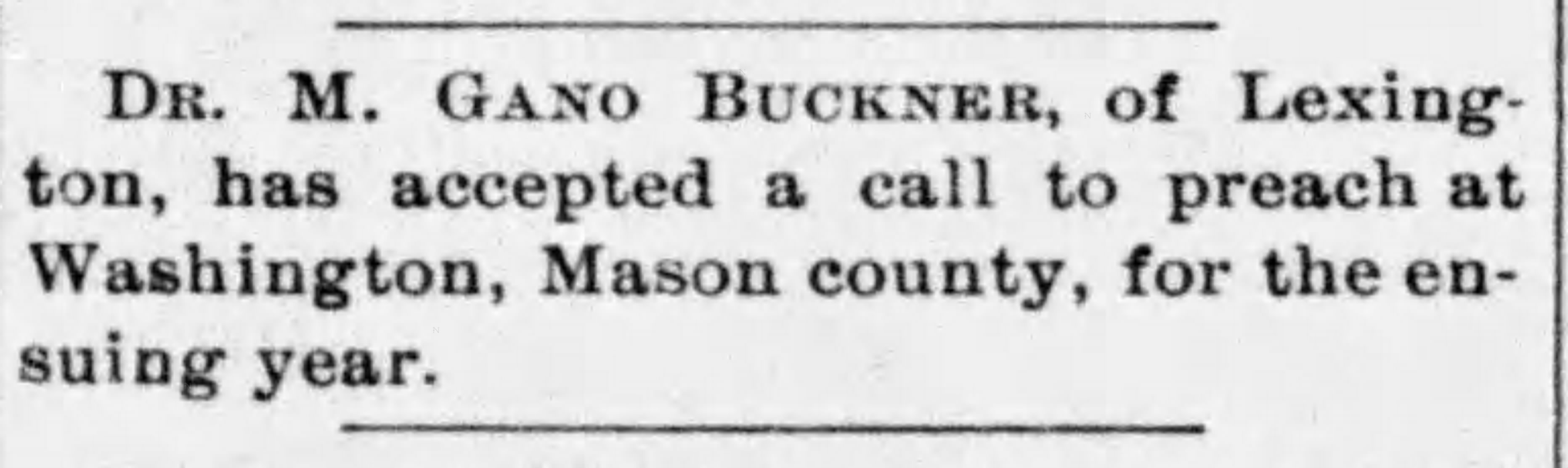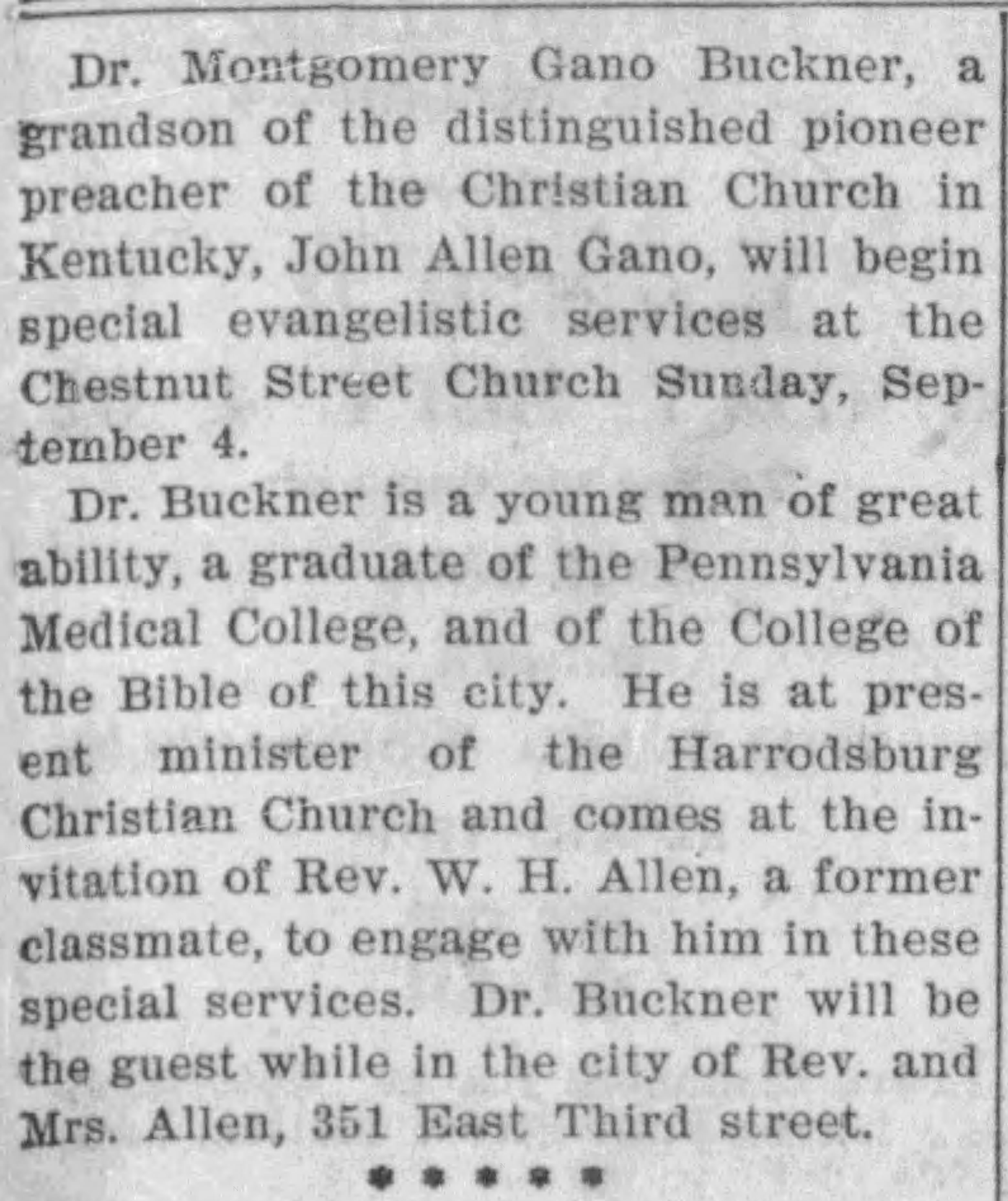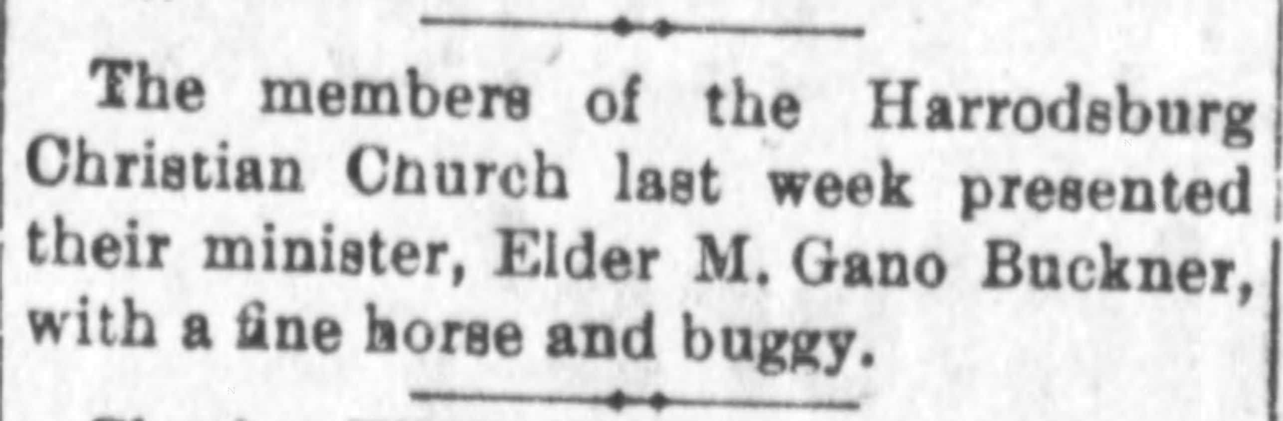 The great preacher and writer John Augustus Williams was a Christian church minister at Harrodsburg for many years. When it was time to lay down his preaching mantel, young Dr. M. Gano Buckner seemed the obvious choice. The family moved to Harrodsburg, where they stayed and worked for several years.