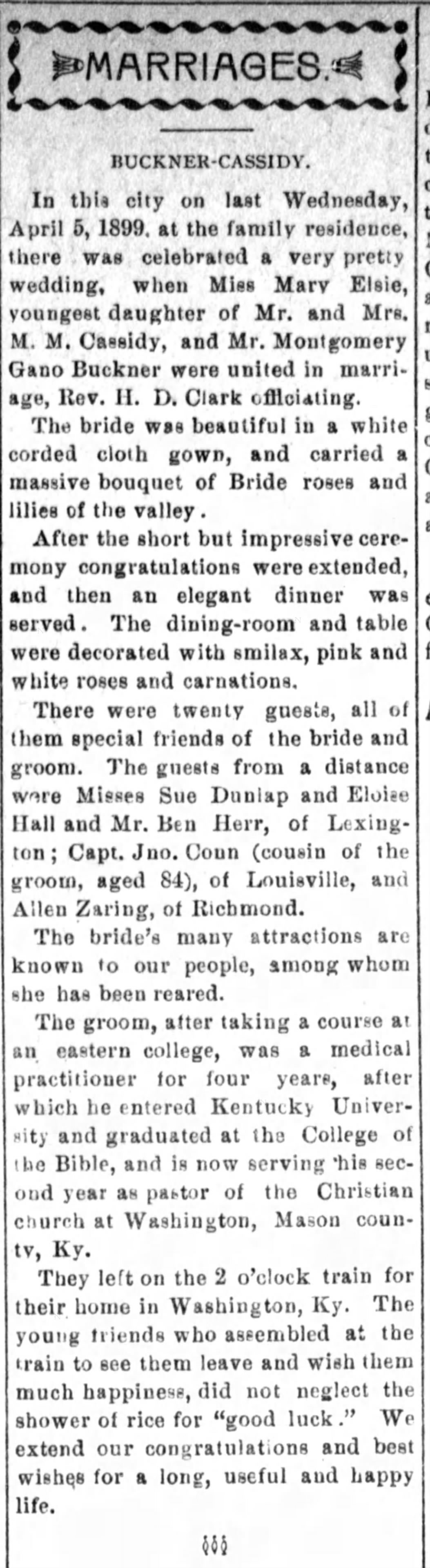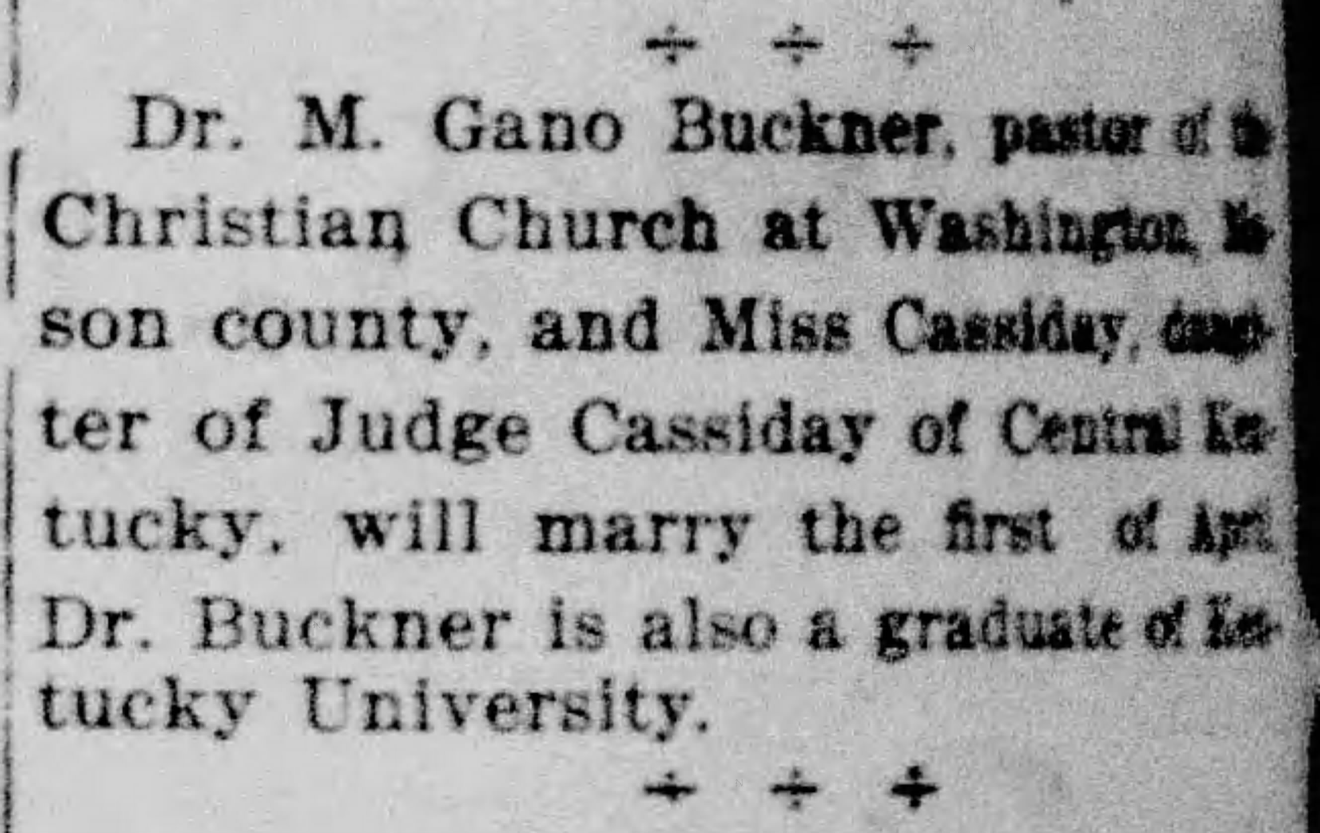 After graduation, one of his first works was with the Christian church at Washington, Mason County, Kentucky. While in this ministry, he met and married his wife, Mary Elsie Cassidy (1879-1939), on April 5, 1899. The couple had one child, Allen Marion Buckner (1900-1950).