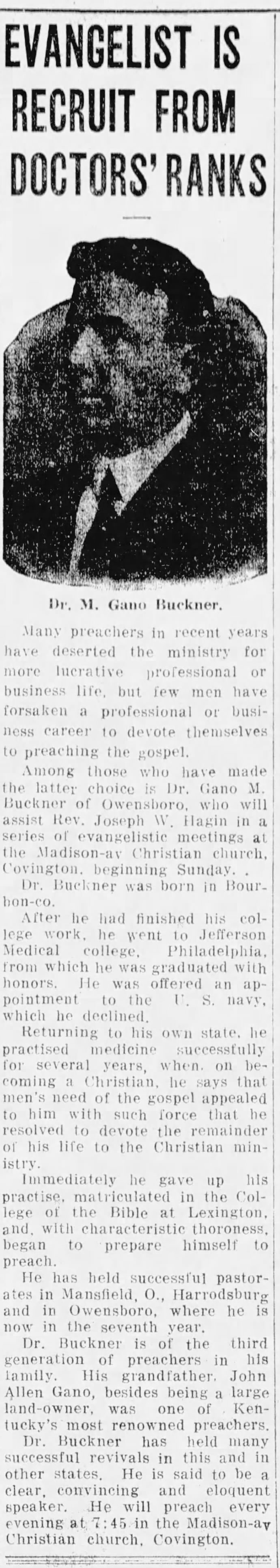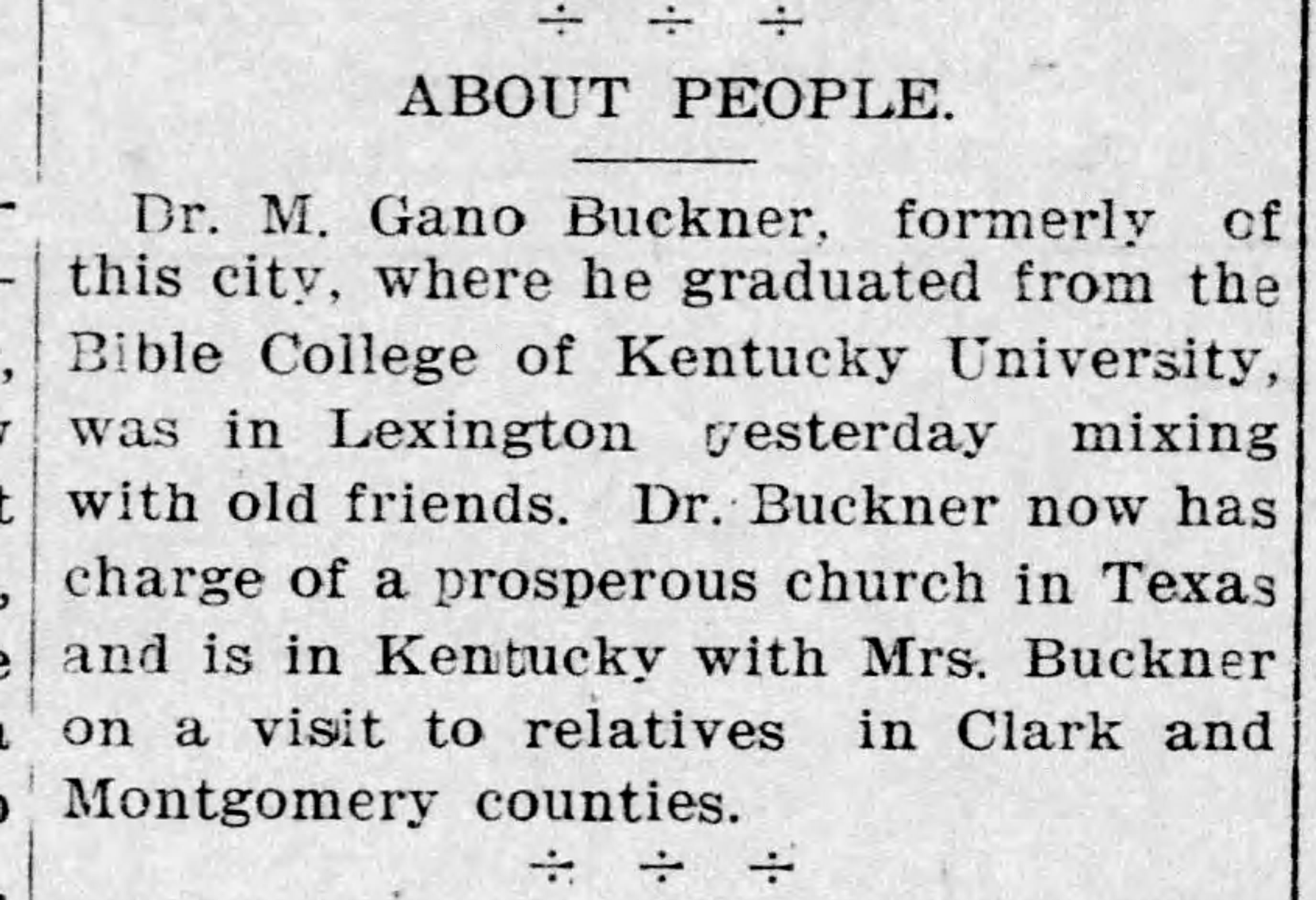 Montgomery Gano Buckner was born in Bourbon County, Kentucky, on February 7, 1871. He was the son of John Willis Buckner (1841-1904) and Mary Eliza Gano (1848-1877). His maternal grandfather was John Allen Gano (1805-1887), the great Kentucky preacher of the Christian movement.