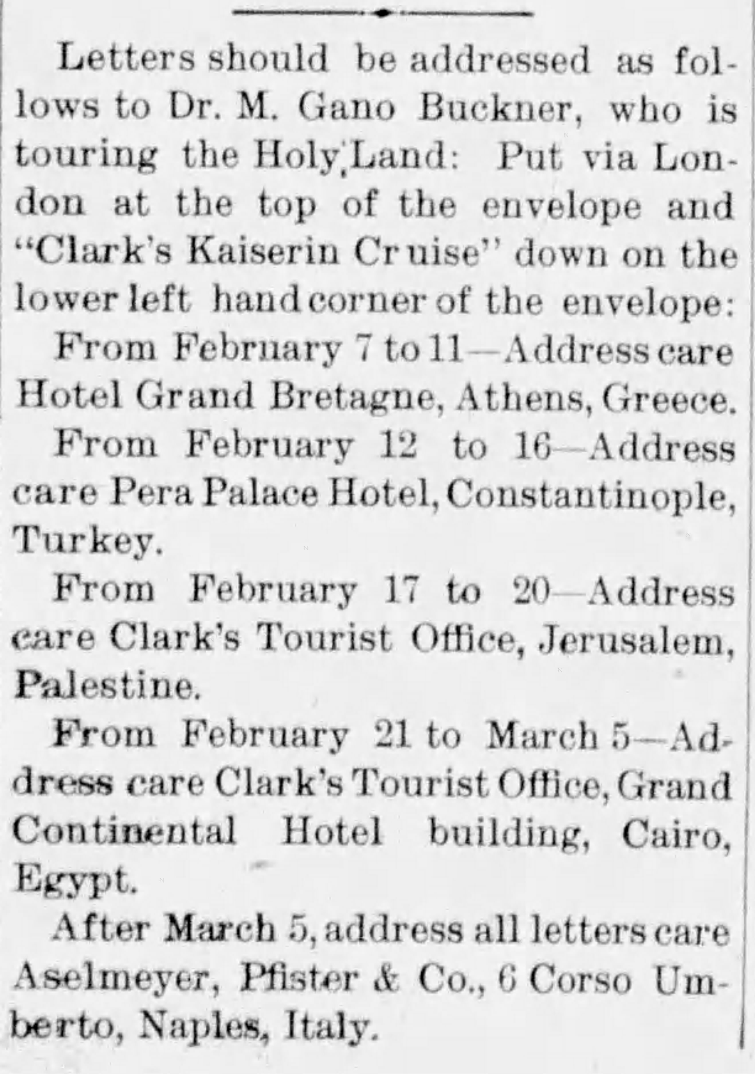 In the Spring of 1903, the Buckners traveled to Europe and the Middle East. His travels took him to London, England; Athens, Greece; Constantinople, Turkey; Jerusalem, Palestine; Cairo, Egypt; and Naples, Italy.