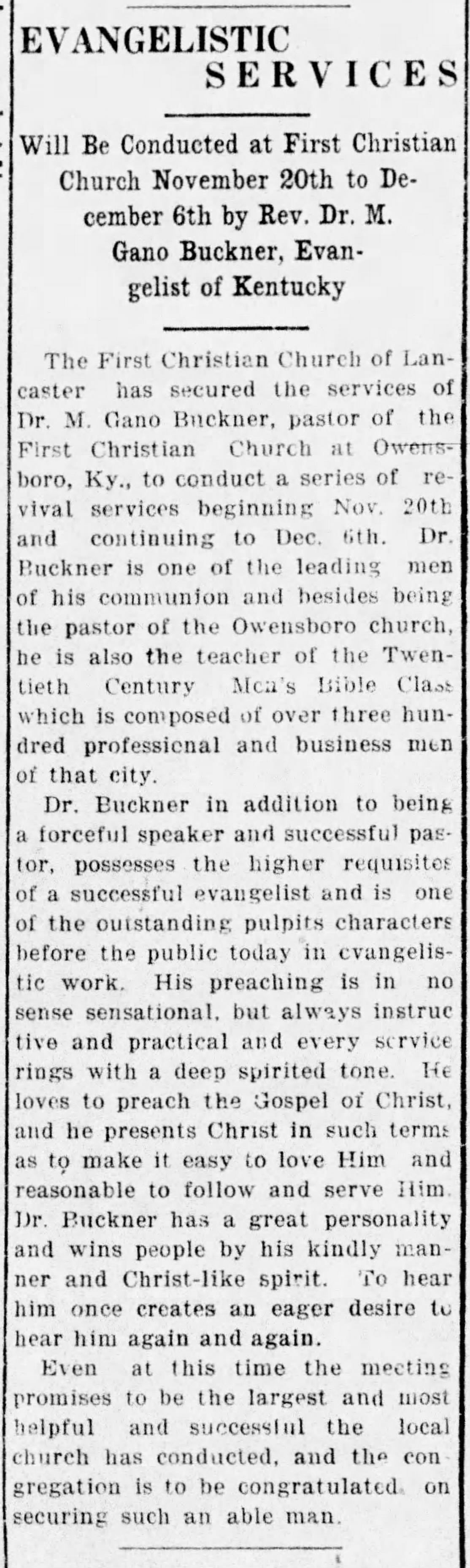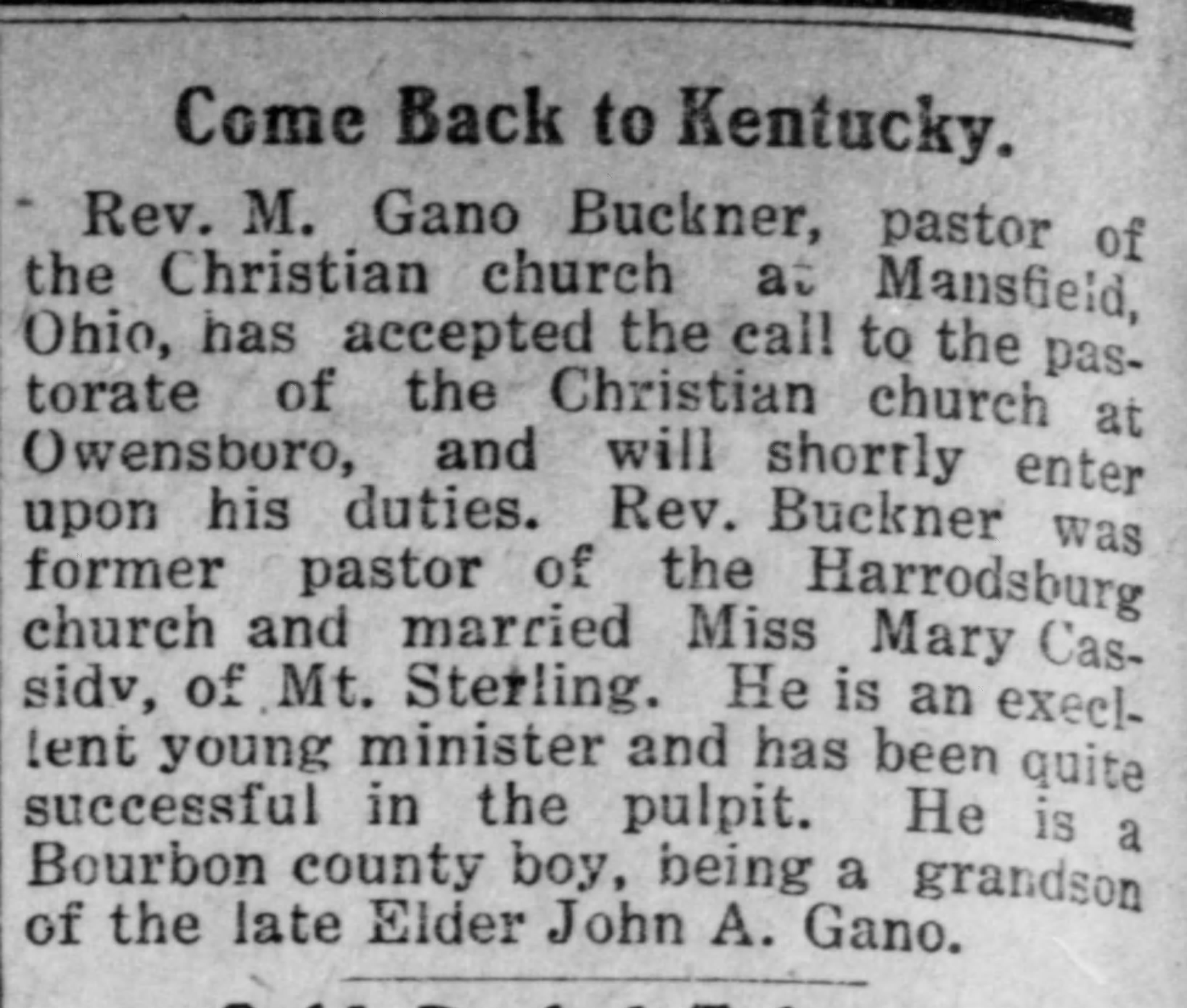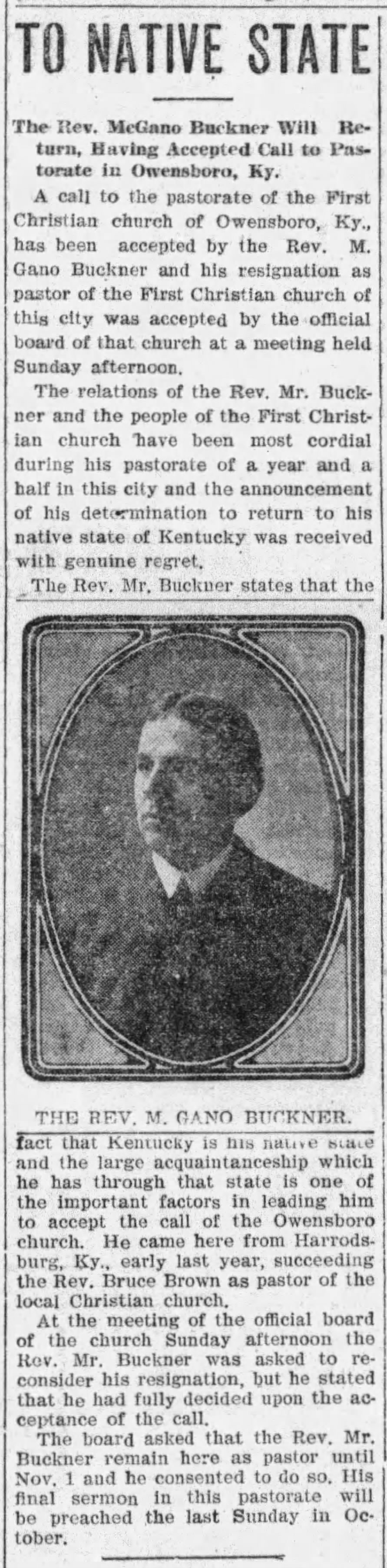 In 1907, the Buckners moved to Mansfield, Ohio, to take up the work there. After only a year, a call came from Owensboro, Kentucky, where Richard Henry Crossfield had preached for many years. The older preacher had been invited to take the presidency of Transylvania University in Lexington, where, beginning in 1908, he served for the next thirteen years and was later President of the College of the Bible. With his move from Owensboro, the Buckners moved to that city to take the lead in the Christian Church there.