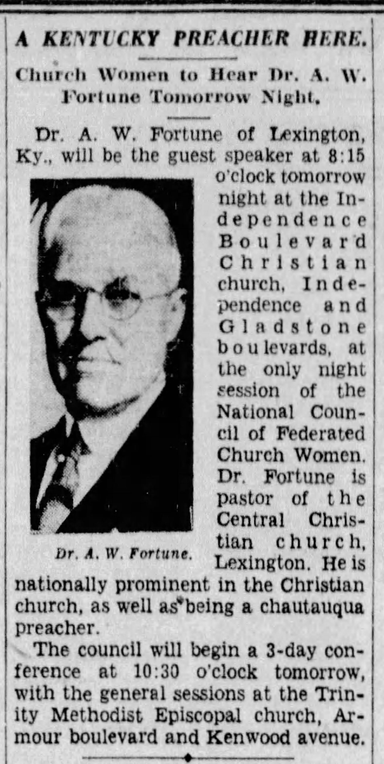 Dr. Fortune came to Lexington in 1912 to teach at the College of the Bible and was its dean from 1917-22. He became pastor of Central Christian Church here in 1922.