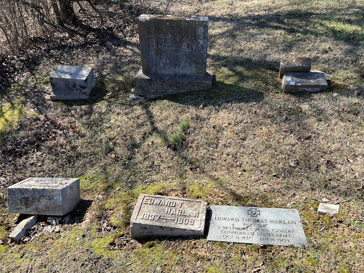 The Harlan Family plot lies in the Still Cemetery in Rockfield, just west of Bowling Green in Warren County, Kentucky. Traveling in southern Kentucky on I-65 head to Bowling Green and take I-165 toward Owensboro. Go two exits and get off at Hwy 68-80 Russellville exit. Turn left at the bottom of the ramp and head toward Russellville. Turn right at Huck's Food and Fuel (Hwy. 432). Go about a mile and the Still Cemetery will be on your left. The Harlan plot is to the left rear of the cemetery.