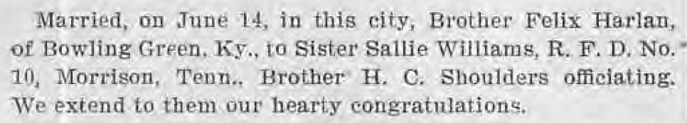 On June 14, 1911, at the age of 35, Felix married Sallie Williams of Morrison, Tennessee. She was a member of the church of Christ. H. C. Shoulders performed the ceremony. Sallie died within a couple years of their marriage, October 28, 1913. She was 37 years of age, having been born March 15, 1876. He was buried near Morrison in the Chestnut Grove Church of Christ Cemetery.