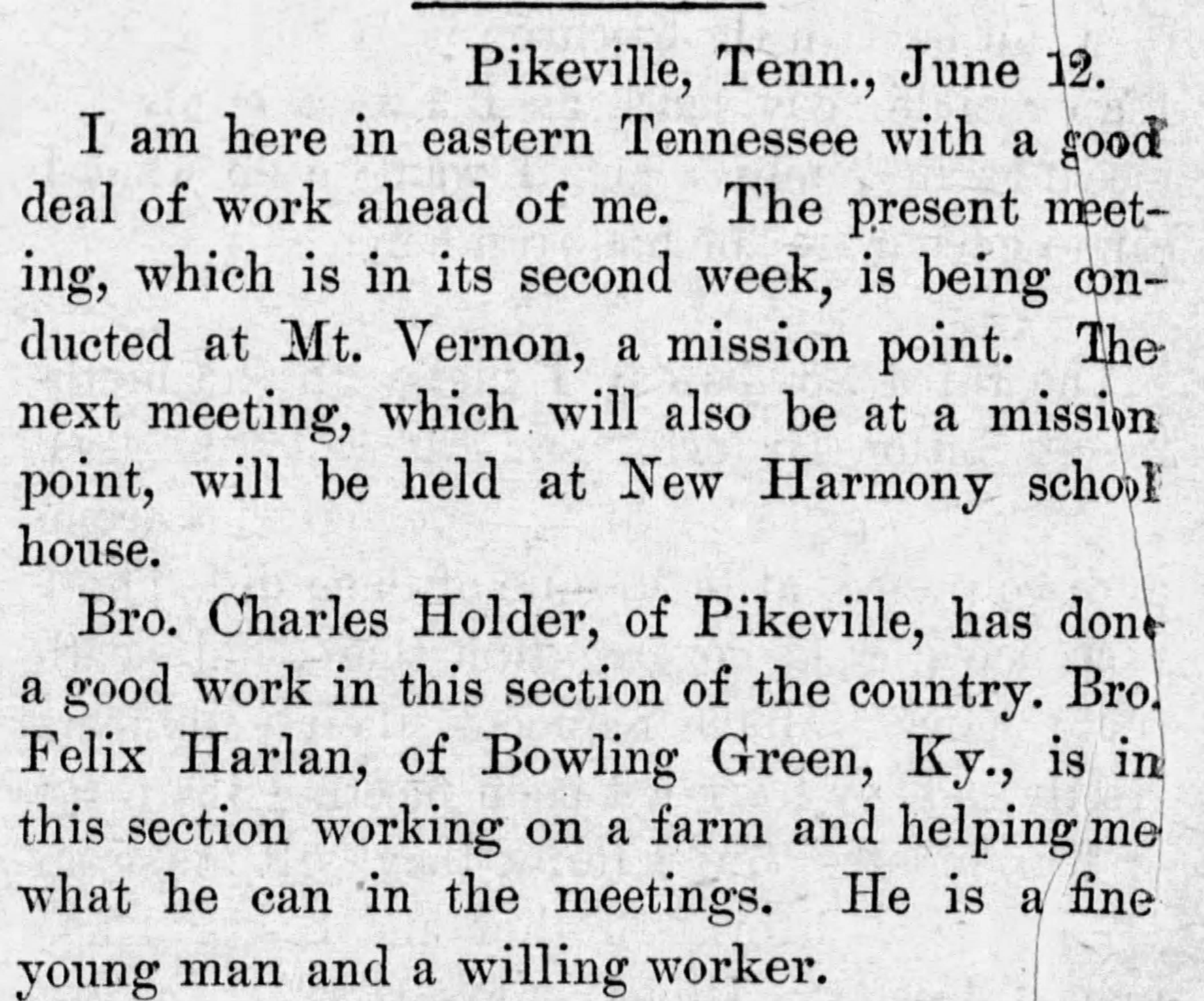 Growing up in farm life, Felix learned the importance of hard work. After leaving home he supported himself working on farms in southern Kentucky and Central Tennessee. But his greater love was preaching the gospel of Jesus. His education is uncertain as of this writing, but there were educational opportunities near him as Potter Bible College was being operated in nearby Bowling Green in his early adult life.
