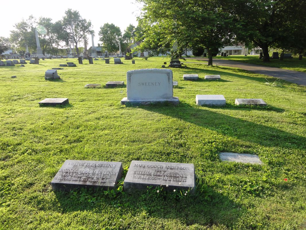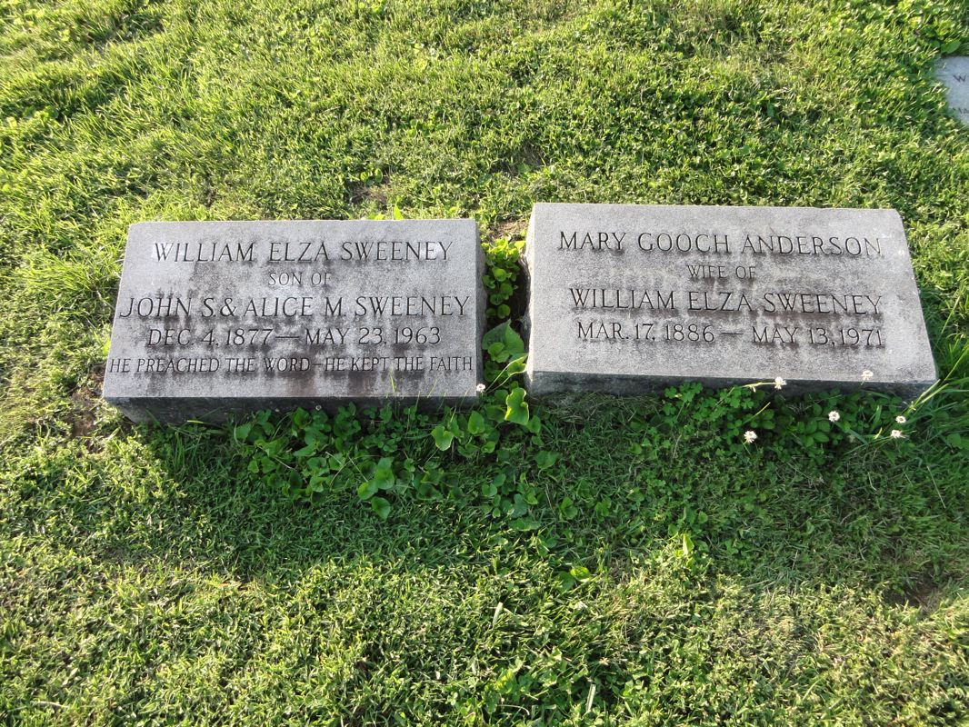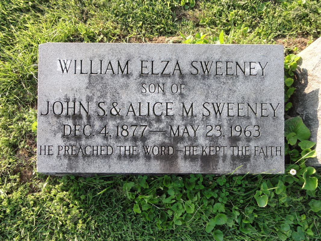The Sweeneys are buried in the cemetery at Paris, Kentucky. Heading northeast out of Lexington on the Paris Pike. (Hwy.27/68). As you enter from the south end of town, look for a white wall on the left that looks like the front of a castle. This is the entrance into the cemetery. Enter the cemetery past the offices and stay to the right. The road will dead end (no pun intended!). Turn to the right, and right back to the left. Then proceed toward the rear of the cemetery. Turn to the right, and right back to the left. Then proceed toward the rear of the cemetery counting to the third left turn. Just before the third left turn, stop the car. Up on the rise to the left is the Sweeney plot. At least three generations of Sweeneys are buried there, J. S. Sweeney, was E. S.'s father, and G. E. Sweeney was his grandfather, both of which were preachers. Four siblings are also there including two of which were preachers, E.S. Sweeney, and of course W.E. Sweeney.