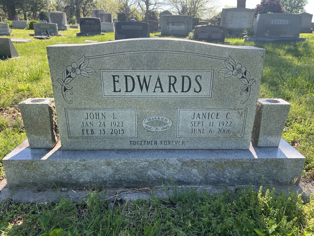 John L. and Janice C. Edwards are buried in the Mt. Comfort Church Cemetery. North of Springfield. Head north of I-44 on N. State Highway H. Head out a few miles to Avalon Community. When H takes a hard turn to the left, continue straight on Missouri KK Rd. Take the next road to the right E. State Kk. Right after the turn, turn right again E. Farm Rd 66. Mt. Comfort church will be on the right. Enter the cemetery on the main drive toward the rear. Stop in the last section on the right and enter the cemetery. You will be very close to the grave. Closeby is the grave of Clarence Wilkerson