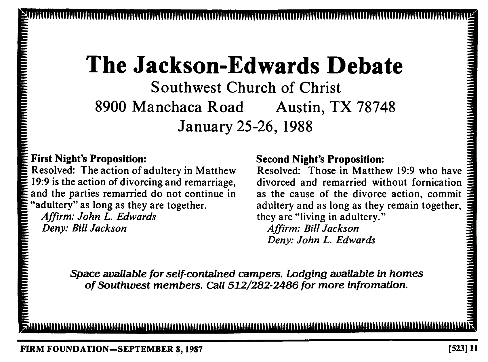 Because of these views, Edwards engaged in a public debate with Bill Jackson in January 1988 at the Southwest Church of Christ in Austin, Texas. The debate addressed whether individuals who had divorced and remarried without scriptural grounds were continuing to live in adultery or whether the adultery occurred only in the act of remarriage. The discussion reflected the intense interest and doctrinal concern surrounding the subject within churches of Christ at the time.