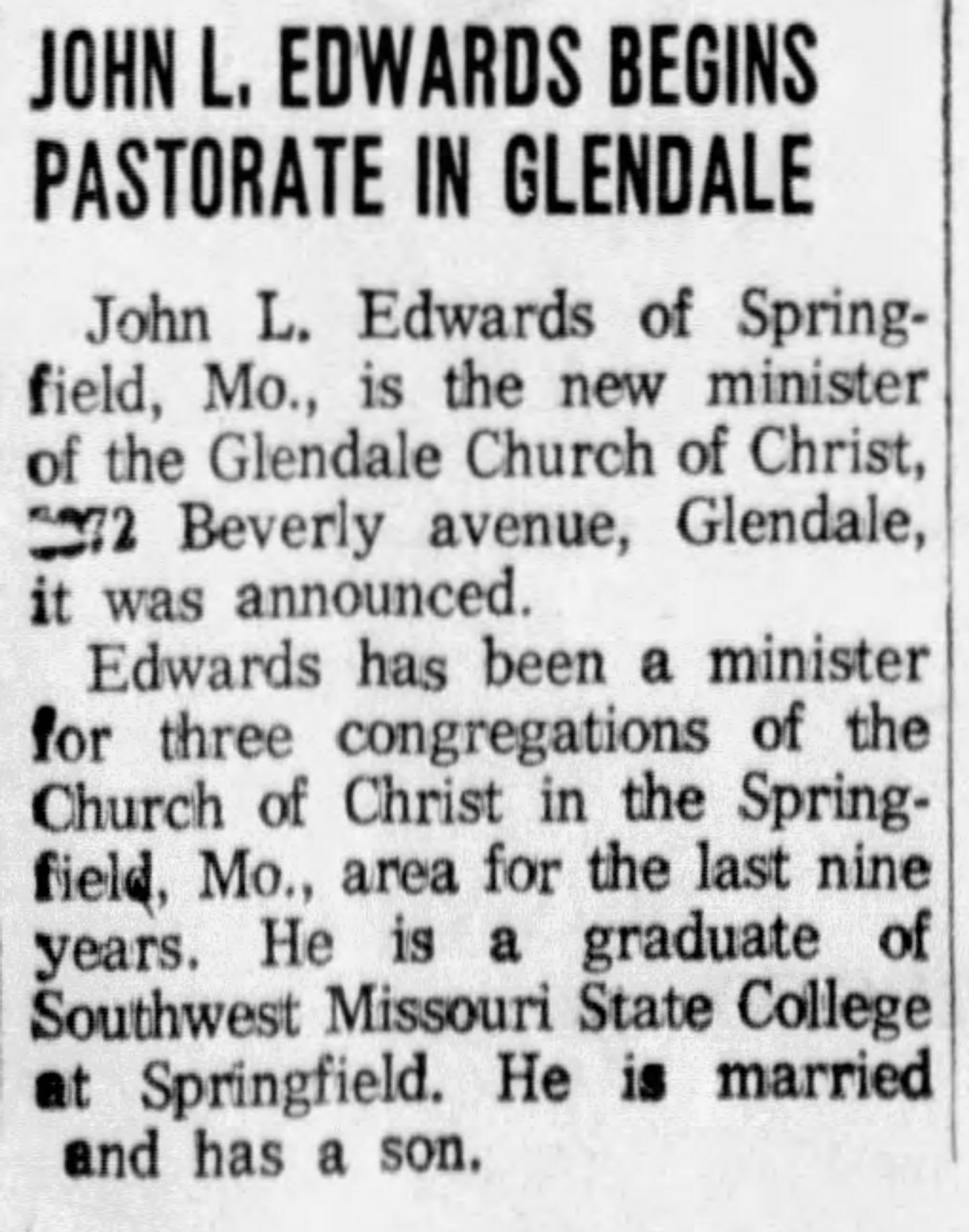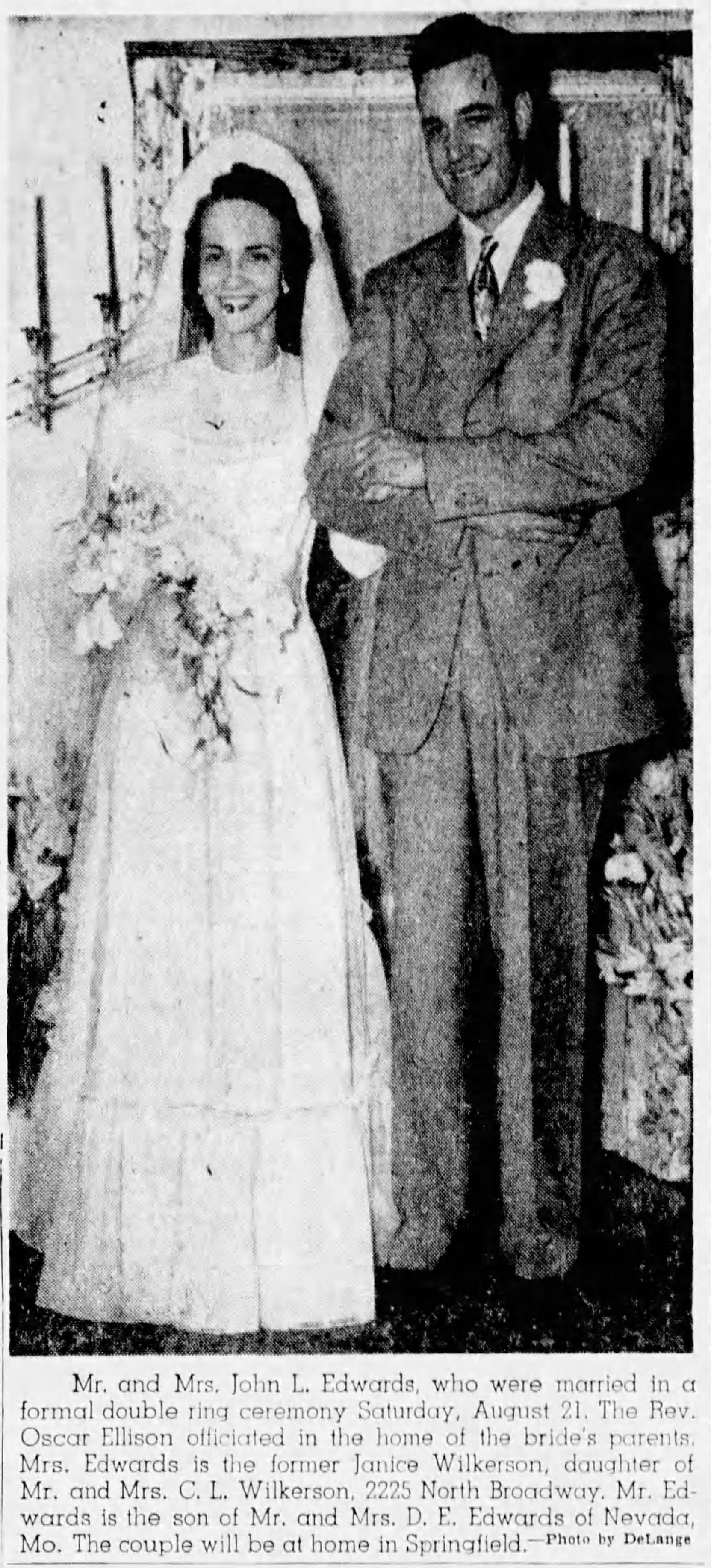 On August 21, 1948, he married Janice Clarene Wilkerson (1922-2006), the daughter of Clarence L. Wilkerson (1888-1949), and Leola Mae Freeman Wilkerson (1895-1988). The couple established their home in Springfield, Missouri, and had two sons. Their first son, Gregory Edwards, was born October 13, 1950. Another son, Kerry (or Cary) Lee Edwards, was born January 2, 1958, but tragically died just a few weeks later on January 23, 1958.