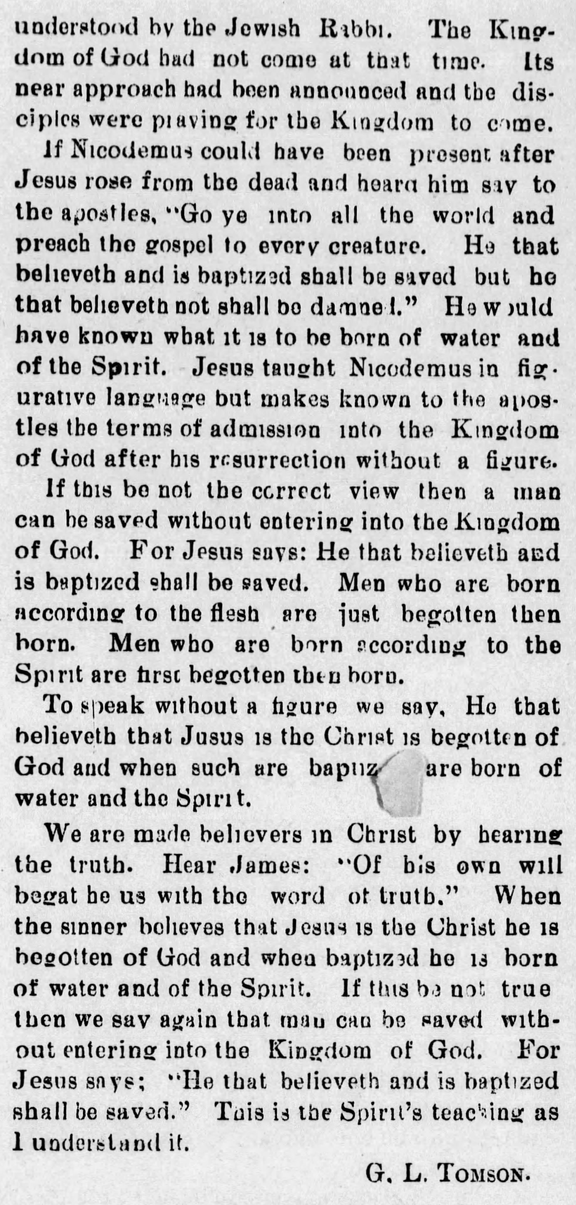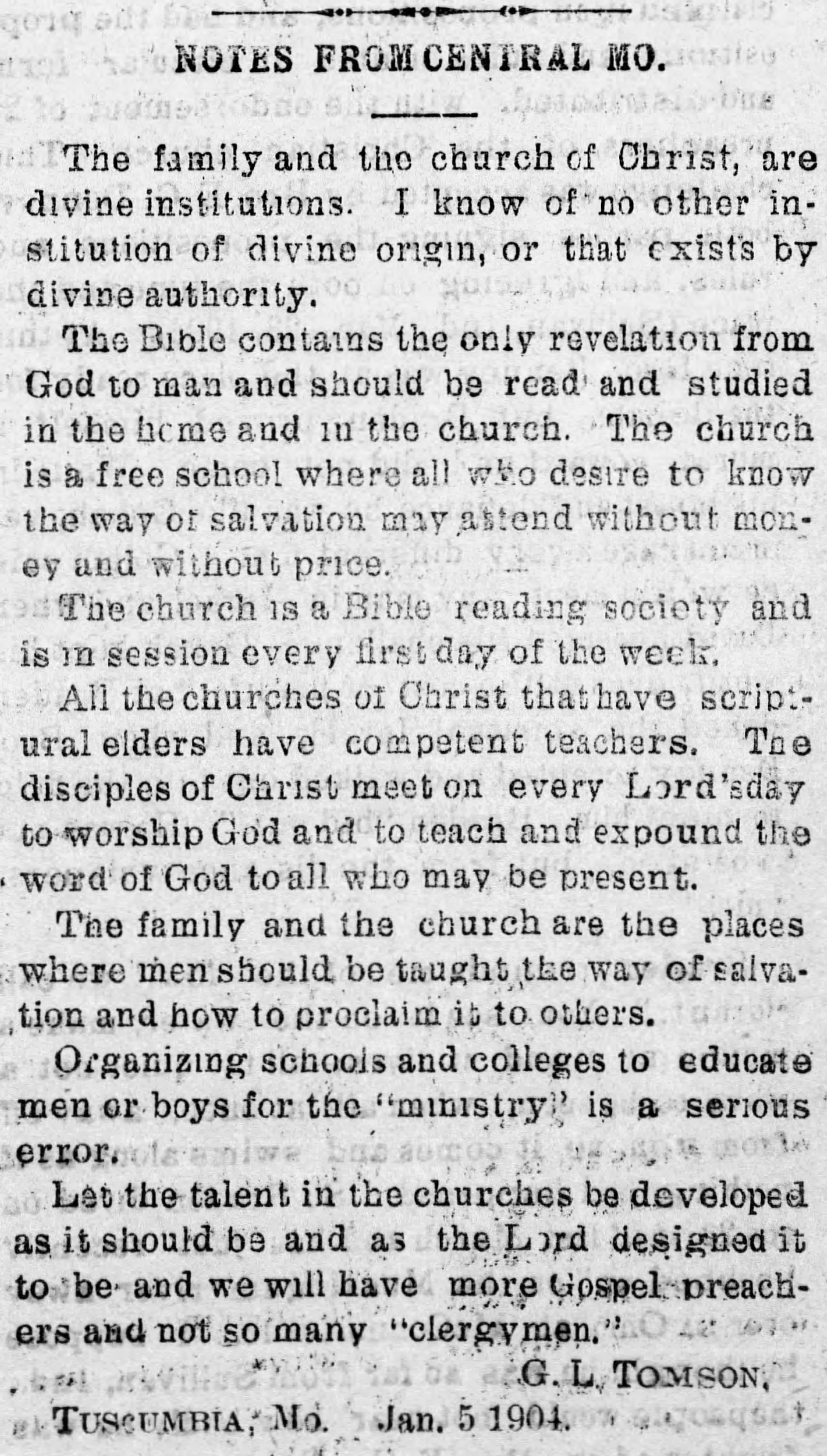 Greene Lee Tomson’s family were dedicated Christians, and had been so for three generations. His grandfather, Henry Tomson, was a gospel preacher. Though his father, Thomas, was not so recognized, he served faithfully in the church where he was. Two of his sons preached. J. H. D. Tomson, preached in many different regions of the country. Greene Lee's career as a minister of the gospel was mostly in the region of his Missouri home, and extended over approximately fifty years. He began preaching at Ginger Ridge Church, north of Tuscumbia, Missouri, in the days when the countryside was still young and communities were scattered.