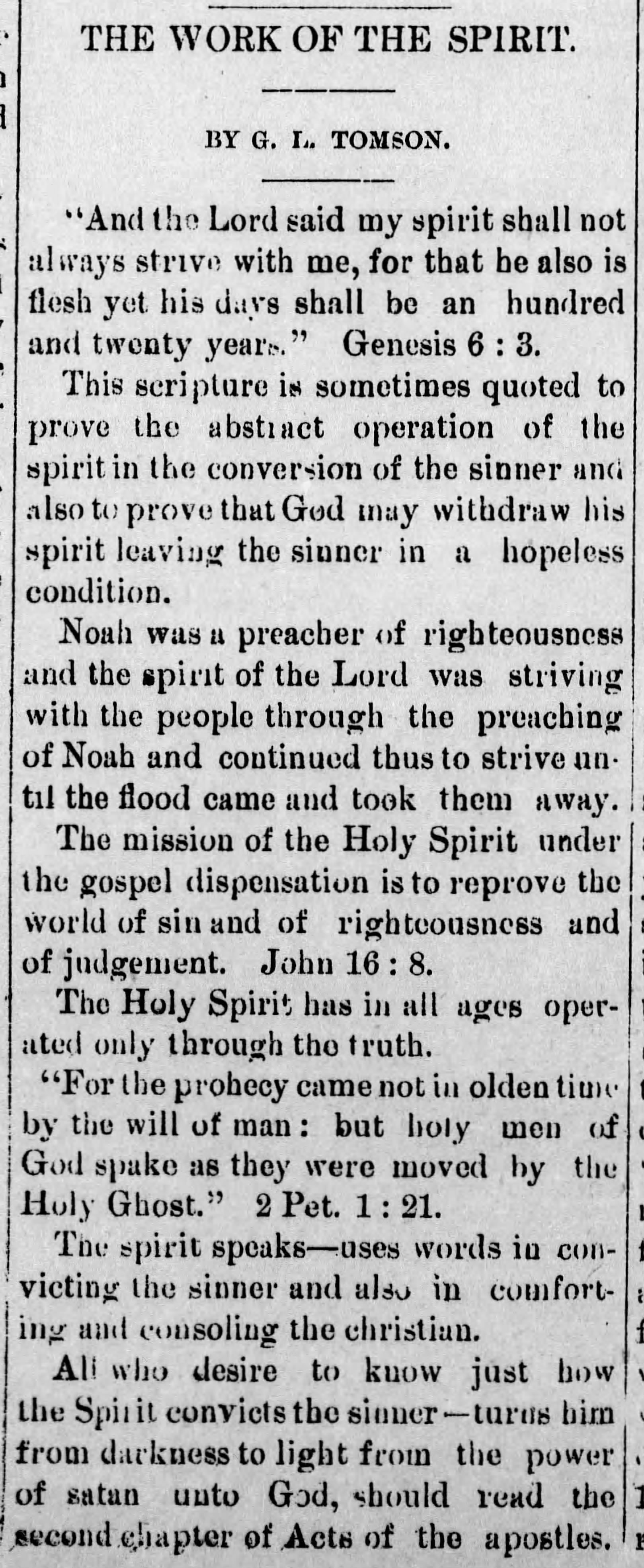 Brother Greene Lee Tomson was born December 19, 1838, in Hardeman county, Tennessee; came with his family to Missouri in March, 1859, residing first in the vicinity of Brazito and Hickory Hill, Cole county, later at and near Spring Garden, Miler county, but for more than thirty years prior to his death, January 26, 1918, made his home near Tuscumbia, Mo., save short sojourns in Colorado and the far West. His career as a minister of the Gospel of Christ covered a period of approximately fifty years.