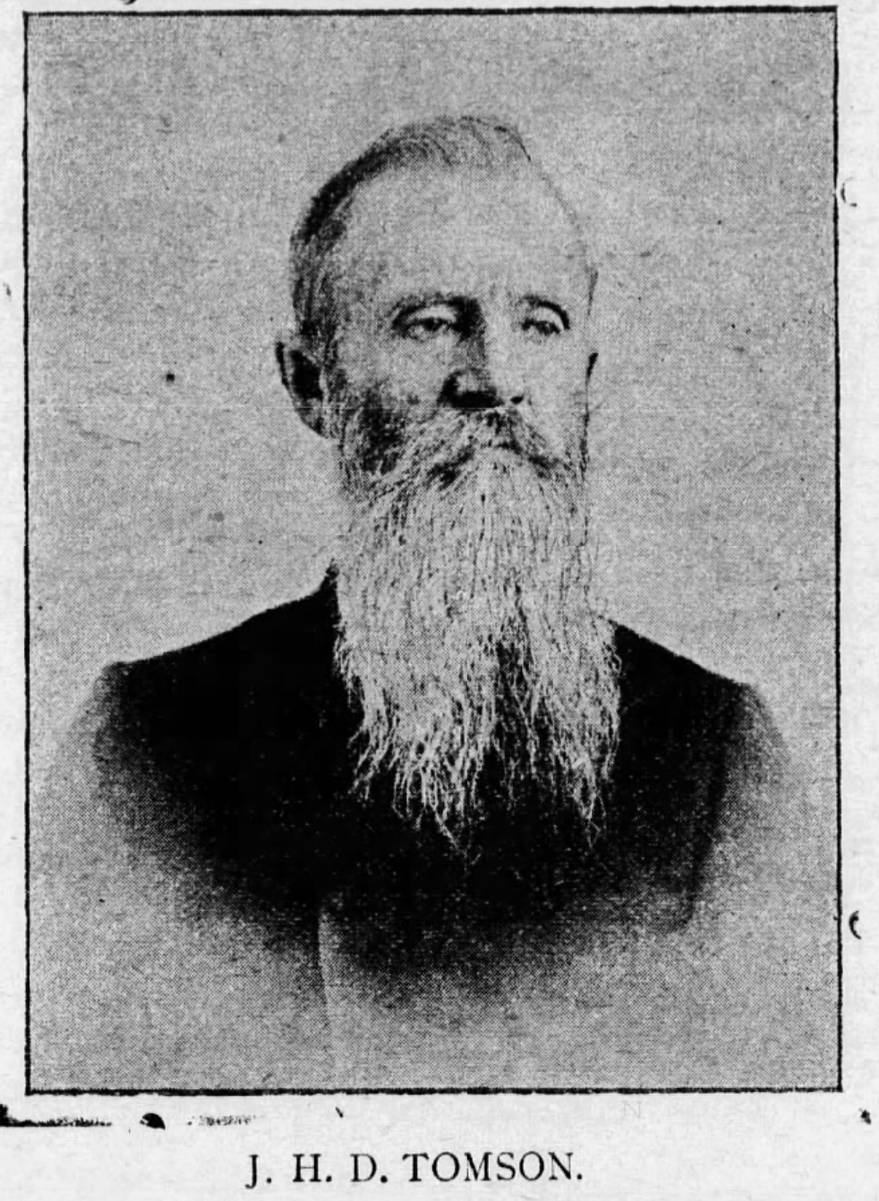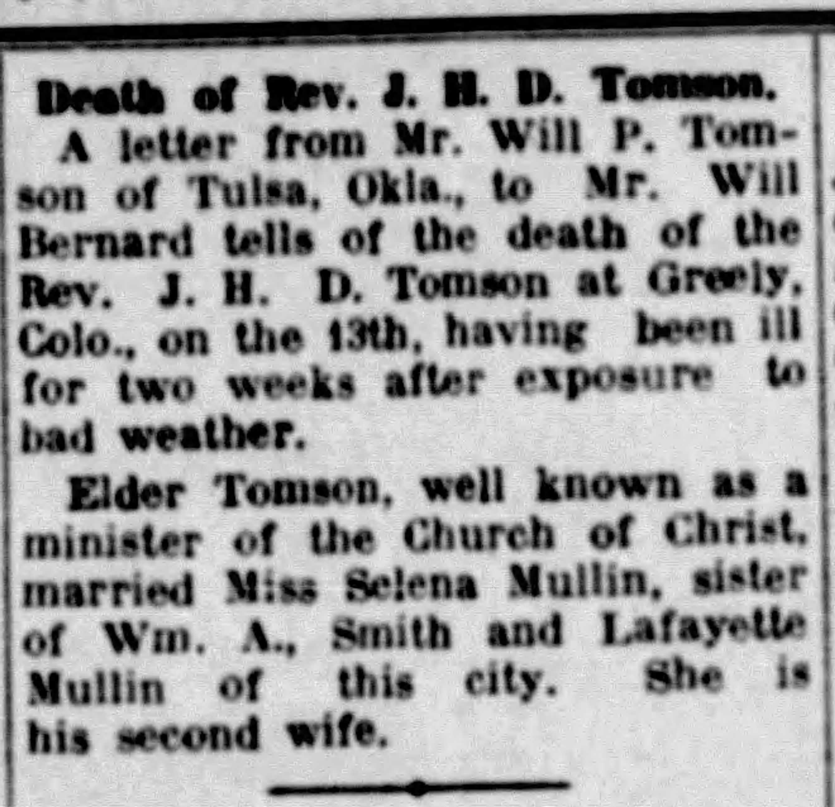 J. H. D. Tomson was born in Tennessee, January 23, 1837, and died at Greeley, Colorado, December 13, at 10 A. M., 1913, aged 76 years, 10 months and 20 days. Fifty-seven years ago he was married to Miss Ann Rainey, and to that union were born six children of which, J. F. Tomson, a minister of the gospel, survives, and is now living in Mississippi. On May 26, 1908, we laid Sister Tomson's body to rest at Marietta, Ohio, she having died there; and on the 19th of December, 1913, Brother Tomson's body was placed beside her.