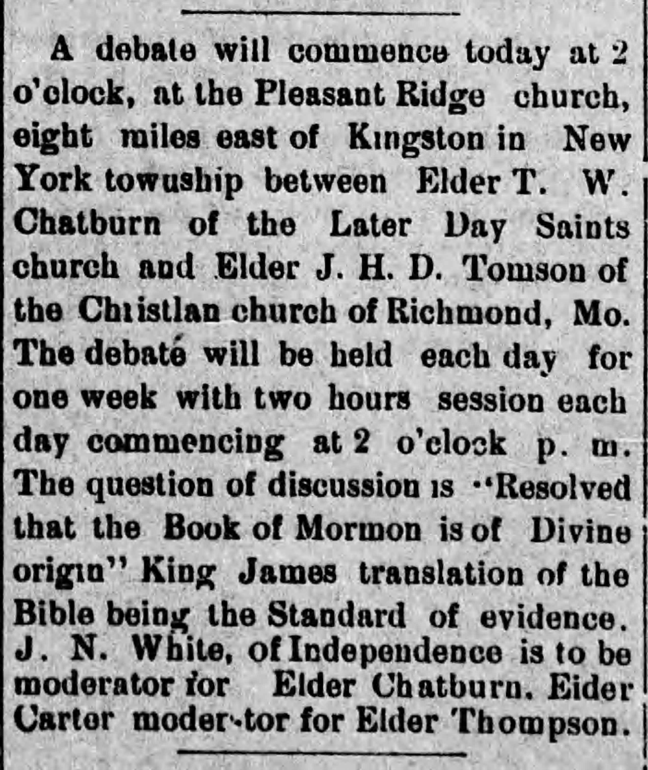 J. H. D. Tomson was married twice, to Miss Ann Eliza Rainey, October 15, 1855; to this union were born five sons and one daughter, the writer of this sketch being the only one living. In A. D. 1858, he removed to Mo., where he spent the greater part of his life. He was married the second time to Miss Salena-Mullin, of Lawson Mo., a most excellent Christian woman. My father obeyed the gospel under the preaching of Bro. O. P. Davis, at Spring Garden, Missouri, and was buried with his Lord in baptism Nov. 30, 1863, after a thickness of ten or twelve inches of ice had been cut. I never heard my father use a by-word, or engage in foolish jesting.