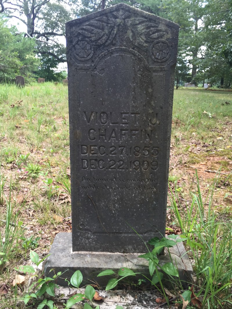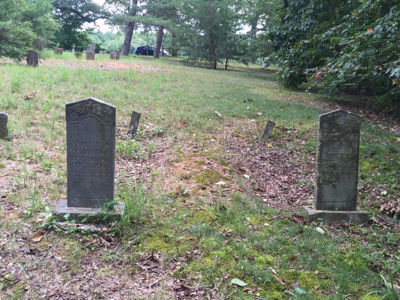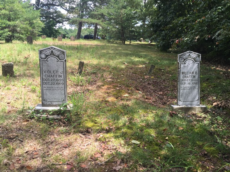 William Riley Chaffin is buried in the Grimes Cemetery, south of the city of Cookeville, Putnam County, Tennessee. On I-40 in east central Tennessee, take Exit 286 (Highway 135). Go south at the exit. At this point you are 8.9 miles from your turnoff. Traveling south on Cookeville Road go 4.9 miles and you will come to a split in the road. Hwy. 135 goes to the left, but you will stay to the right. The road becomes Cookville Boat Dock Rd. From the split go 4.0 miles through the Nash Community, and turn left on Ball Hill Rd. Go 1.1 miles, past John Rice Rd, past Medlin Rd. and the road will dead end into about five silos and a farm. The road to the left is Old Mill Rd. However you will turn to the right on the gravel road that leads you onto a farm. Go out the farm road .3 miles and turn right onto another gravel road. At the end of this road (.1 miles) on the right is the Grimes Cemetery. According to H. Leo Boles above you are now on the old farm of W.R. Chaffin. There is no sign showing the name of the cemetery. When you enter the cemetery through the cattle gate, go all the way to the back of the cemetery and to the left corner. The last two graves are that of W.R. Chaffin and his wife Violet.