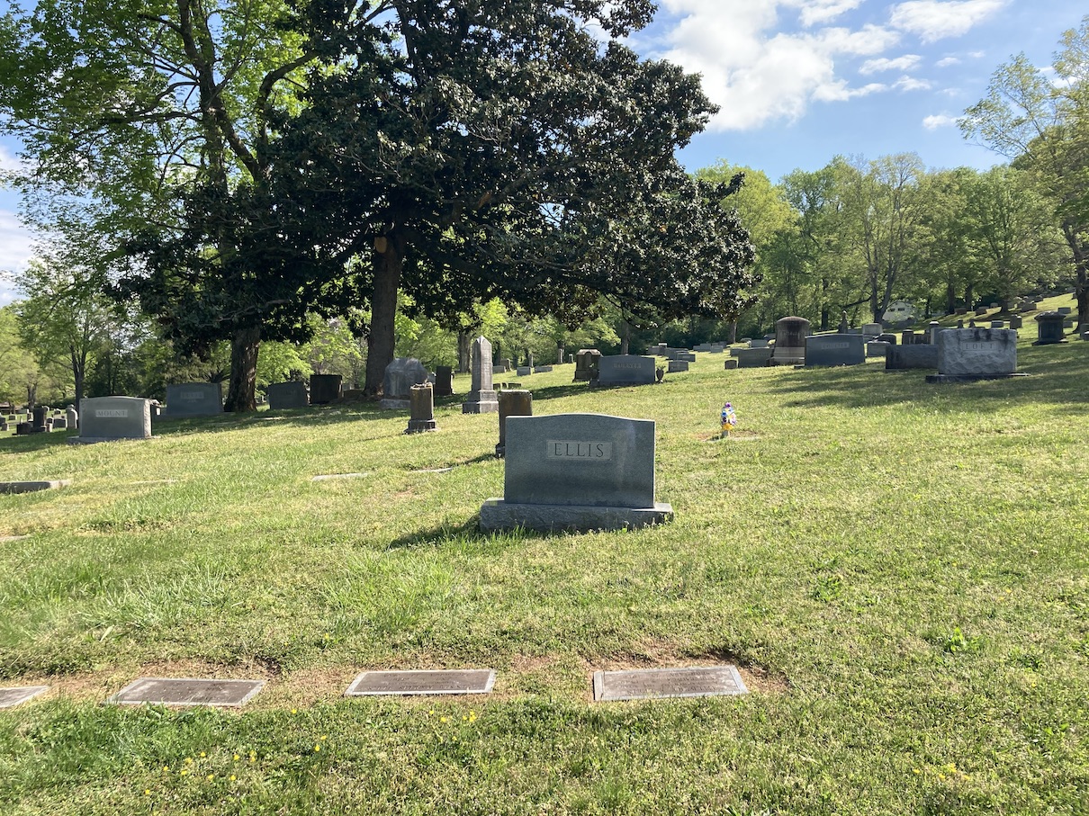 The Ellis family are buried in the Woodlawn Cemetery in South Knoxville. From the interstate take US-441S, cross the Tennessee River and continue south. Turn left on Woodlawn Pike and main entrance of the cemetery will be you your right. Travel up the hill from the entrance past the offices on up the hill until the there is an obvious bearing to the right and just a little up the hill on the left you will easily spot the Ellis plot fairly near the road. See GPS below for actual location of the grave, and the photos below can assist.