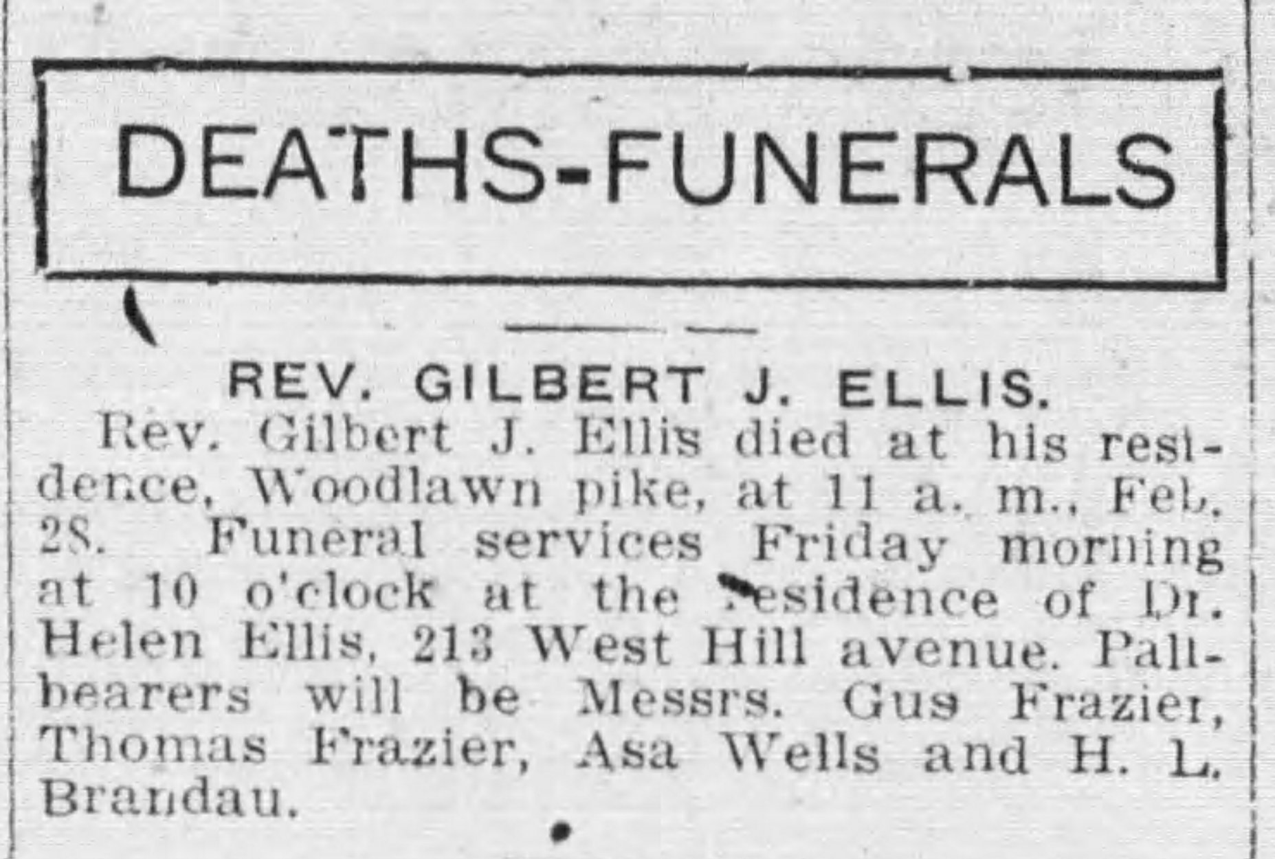 While in Knoxville the family lived on Woodlawn Pike. Brother Ellis passed away on February 28, 1915, and burial followed in the Woodlawn Cemetery.