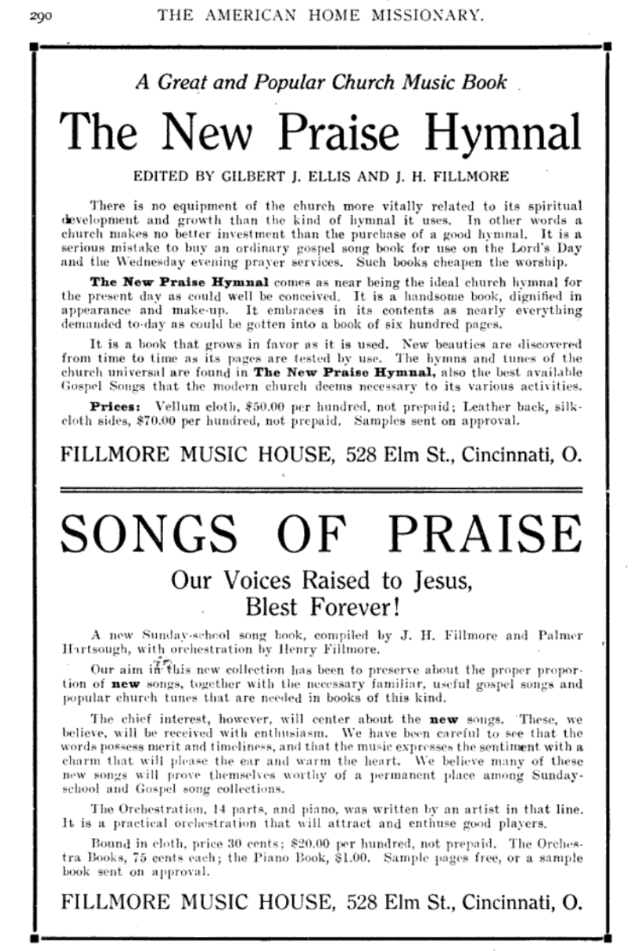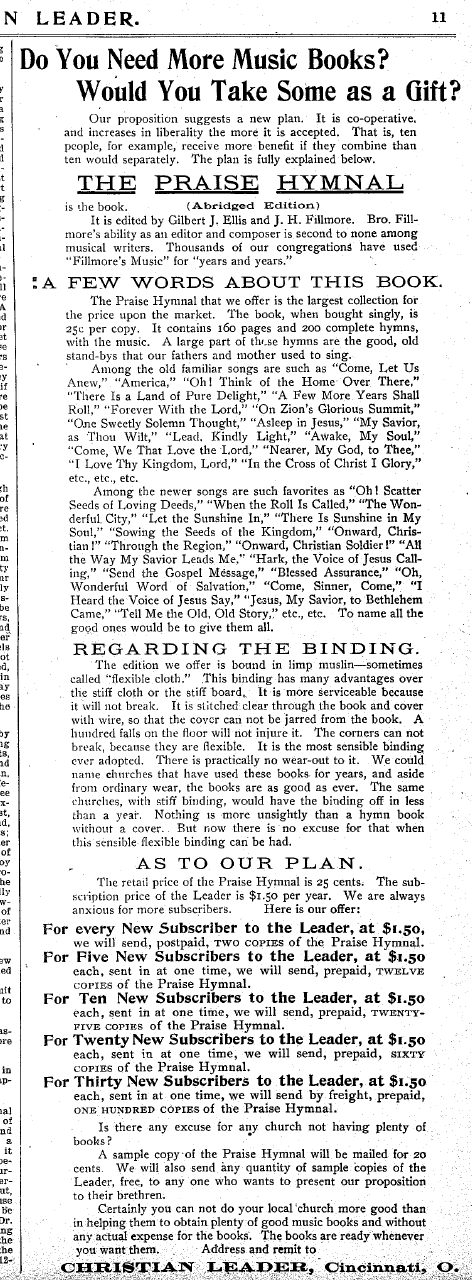 In 1896, Gilbert Ellis and James Henry Fillmore produced a church hymnal called, The Praise Hymnal, a Collection of Hymns and Tunes. It was produced by the Fillmore Brothers Publishers in Cincinnati, Ohio. The book contained 554 hymns and gospel songs on 512 pages. It was later revised in 1906, and used many years among Christian Churches.