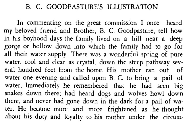 Benton Cordell Goodpasture remembers distinctly the first sermon he preached, but he cannot remember when he did not plan to be a preacher. He preached his first sermon October 18, 1912, in the Holly Springs school house on a Sunday evening. Cordell had attended the Holly Springs "subscription schools" and knew most of the neighborhood people. Several were members of the church of Christ. The school served as a community center, and members of the church of Christ conducted worship services each Lord's day. The seventeen-year old boy chose this place to start preaching because he had often spoken there in debates, and the older people had heard him on those occasions. He thought the Holly Springs community would be a good place to begin. Holly Springs was widely known around Hilham because of the debates and other such activities of community interest that were conducted there. About that first sermon he said in later years: "Well, I just made up my mind I wanted to begin preaching and had the brethren to announce it."