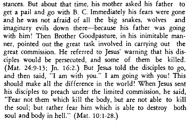 T. C. Fox was holding a meeting at Flat Creek when Cordell was fourteen years old, and he decided then to become a Christian. Barlow Smith, one of his best friends, also made up his mind to accept the gospel. He was fifteen at the time. They were baptized in the "whirl hole" in Flat Creek just across the road from the Goodpasture home. This marked another period in the life of B.C. Goodpasture. The boy could not have reckoned that one day he would become one of the most influential leaders of the church of Christ in this century. Cordell from that time on became a serious student of the Bible.