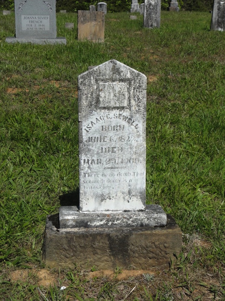 Isaac C. Sewell asked that his name be taken off the church list of the Baptist Church at the time Jesse L. was excluded from fellowship. He rendered great service to the church, being a good song leader, an efficient school-teacher, and an acceptable preacher. He did not travel and preach so extensively as his brothers. He was never married. There is an old moss-covered slab in the Sewell graveyard, near the old homestead, which bears this inscription: "Isaac C. Sewell, born June 6, 1822; died March 29, 1900. 'There is no death. That seemeth transition.'''