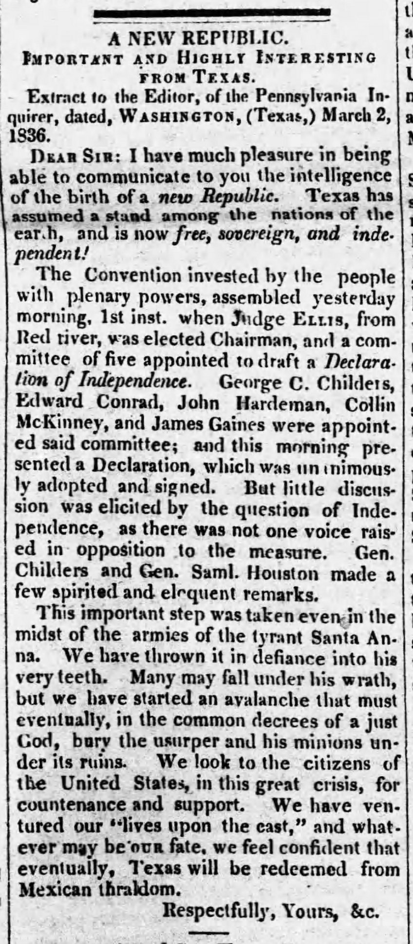"In January, 1836, he was elected a delegate to the General Convention at Washington-on-the-Brazos and there served on a committee of five that drafted Texas' Declaration of Independence from Mexico. On March 2, he signed the document. He also served on the committee which prepared the Constitution for the Republic of Texas. Later he served in the 1st, 2nd, and 4th Congress of the Republic. In private life, McKinney was leader in establishing the Church of Christ in Texas." (Historical Marker, Grayson County, Texas)