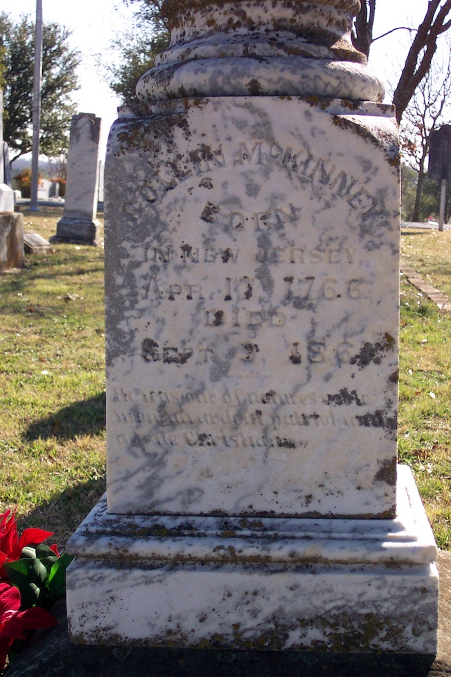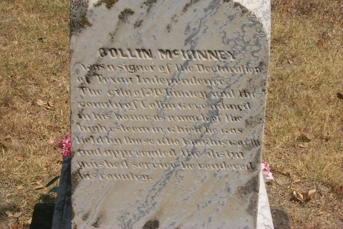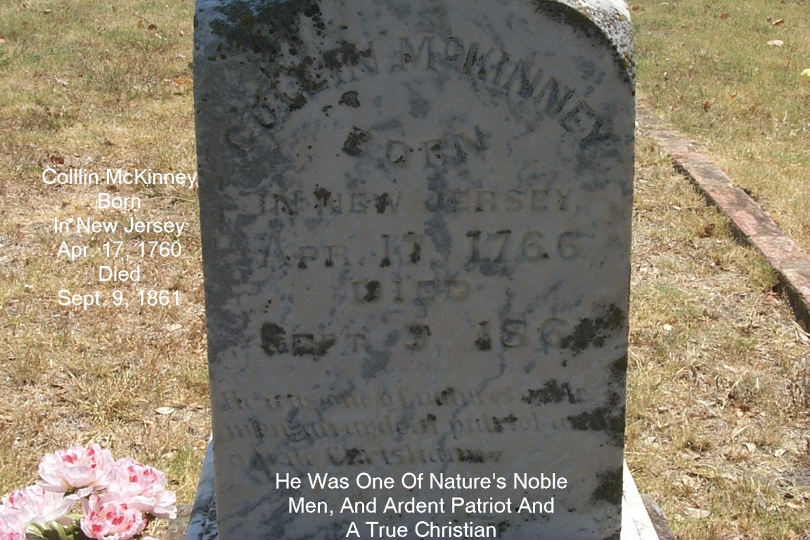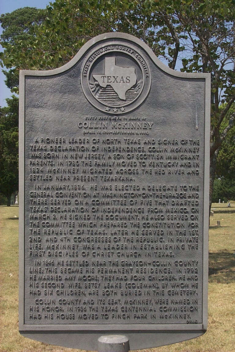 "Collin McKinney (April 17, 1766-September 8, 1861). A pioneer leader of North Texas and signer of the Texas Declaration of Independence, Collin McKinney was born in New Jersey, a son of Scottish immigrant parents. In 1780 the family moved to Kentucky and in 1824 McKinney migrated across the Red River and settled near present Texarkana." (Historical Marker, Grayson County, Texas)