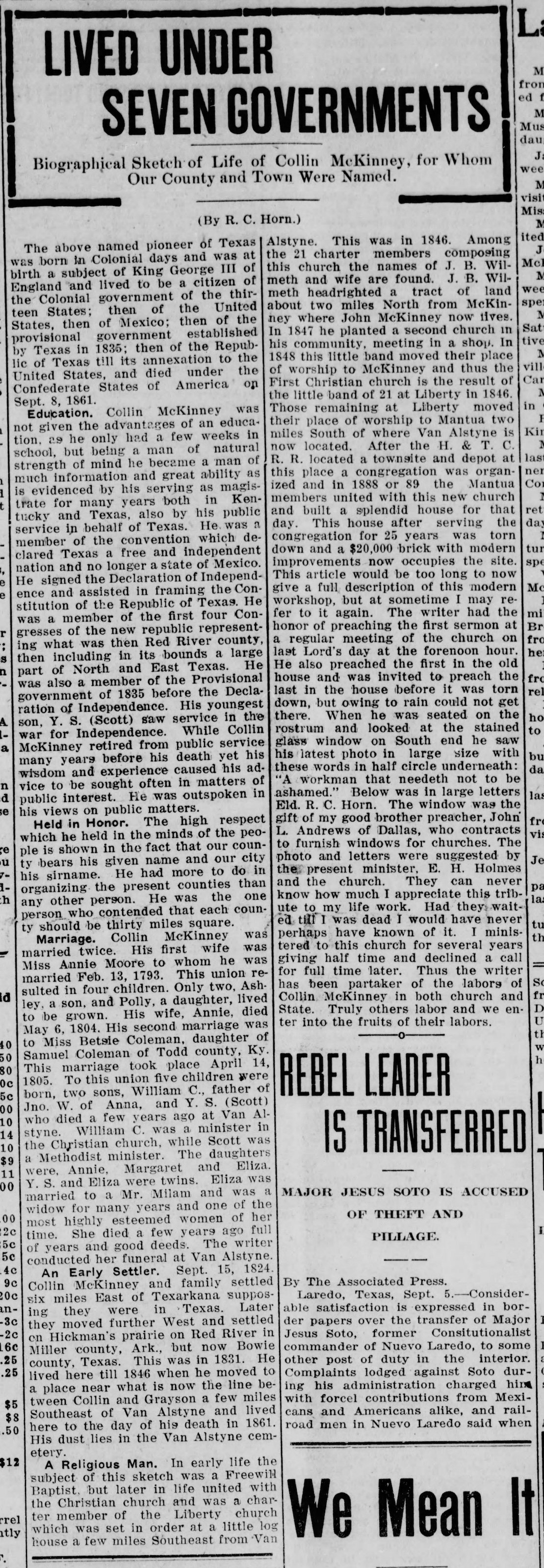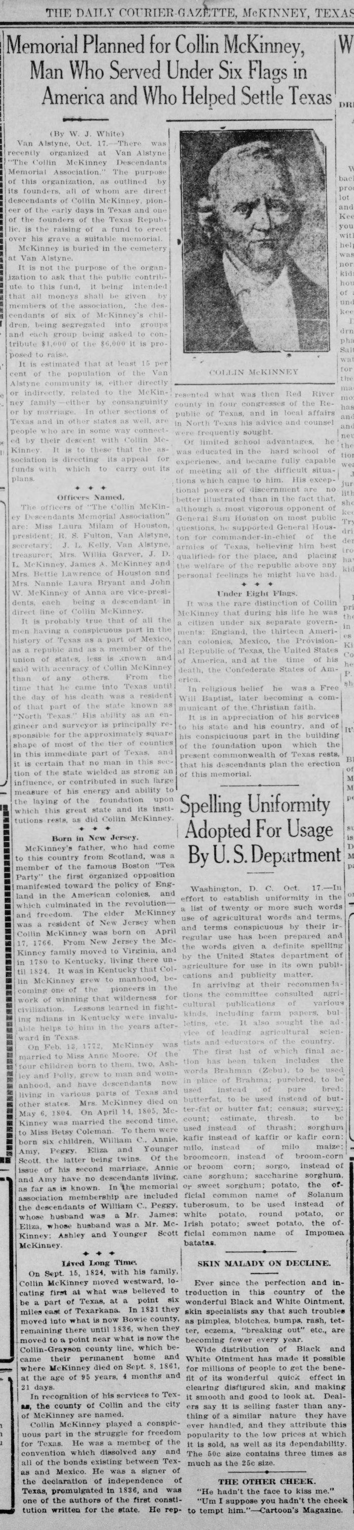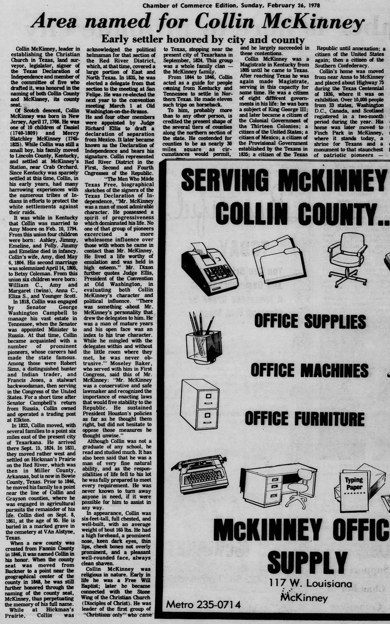 "In 1846 he settled near the Grayson-Collin county line; this became his permanent residence. Collin County and its seat, McKinney, were named in his honor. In 1936 Texas Centennial Commission had his house moved to Finch Park in McKinney." (Historical Marker, Grayson County, Texas)