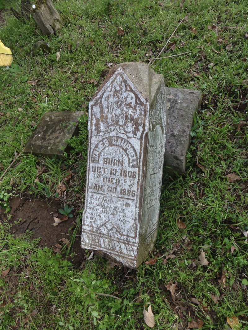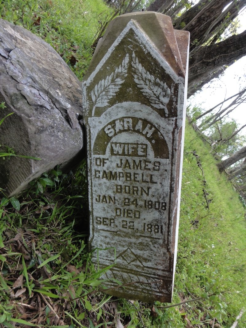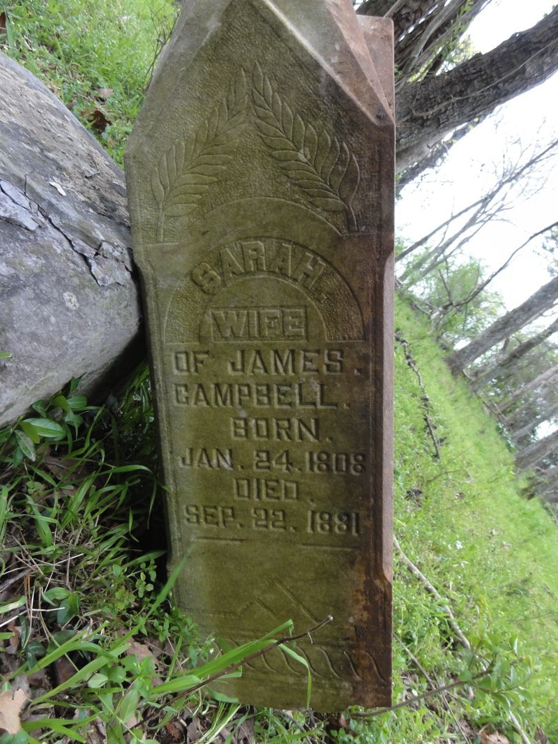 The Campbells are buried in the Hardin Cemetery or (Harding Cemetery) in Walker County, Georgia. From Lafayette, go north on Hwy. 27. Just north of town turn left on CO136. Go about five miles to a four-way stop. Turn left on CO341. Go a couple miles and turn right on Halls Mill Rd. Halls Mill will dead end into Kensington Road. Turn left onto Kensington Road, and go for about a half-mile. When you see Proctor Road on the right, stop the car in front of it. Directly across from Proctor Road you should see a cattle gate that enters a field. Look off into the field beyond the gate, and in the distance and slightly to the left. On a knoll in the distance will be a fenced in a group of trees. It lies about 2/10ths of a mile from the road. When I was there in the spring of 2011, the field was already getting overgrown. It appears that the graveyard is on private land. Also, you would not want to visit the cemetery during the summertime. Better in the winter or early spring. Just north of the center of the graveyard is the grave of James and Sarah Campbell.